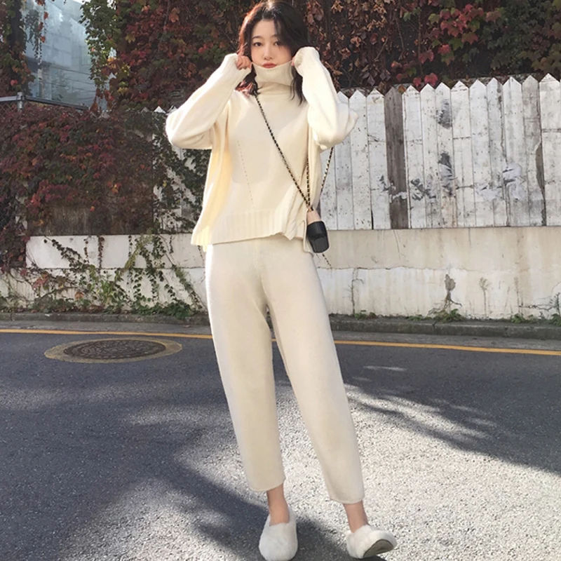 Женский трикотажный костюм, Повседневный свитер и брюки с высоким воротником, осень 2020