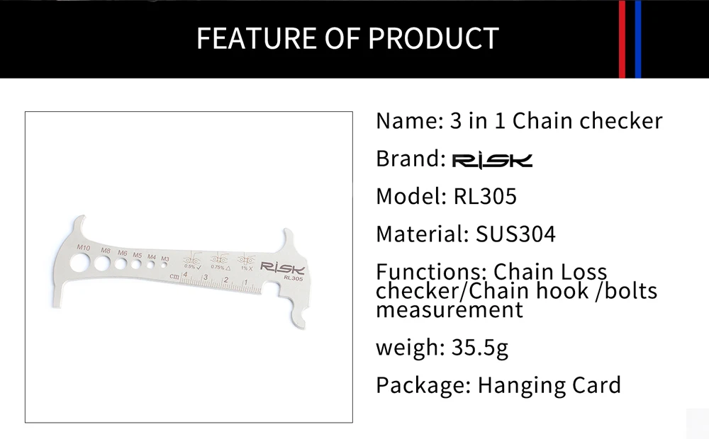Технические характеристики:Материал: нержавеющая сталь SUS304Вес: около 35,5 гТип: 3 в 1 инструмент для велосипедной цепиХарактеристика: 1. Измерение износа цепи2. Может использоваться в качестве цепного крючка3. Измерение длины и диаметра винтаКомплектация включает в себя:1 х велосипедная цепь Checker