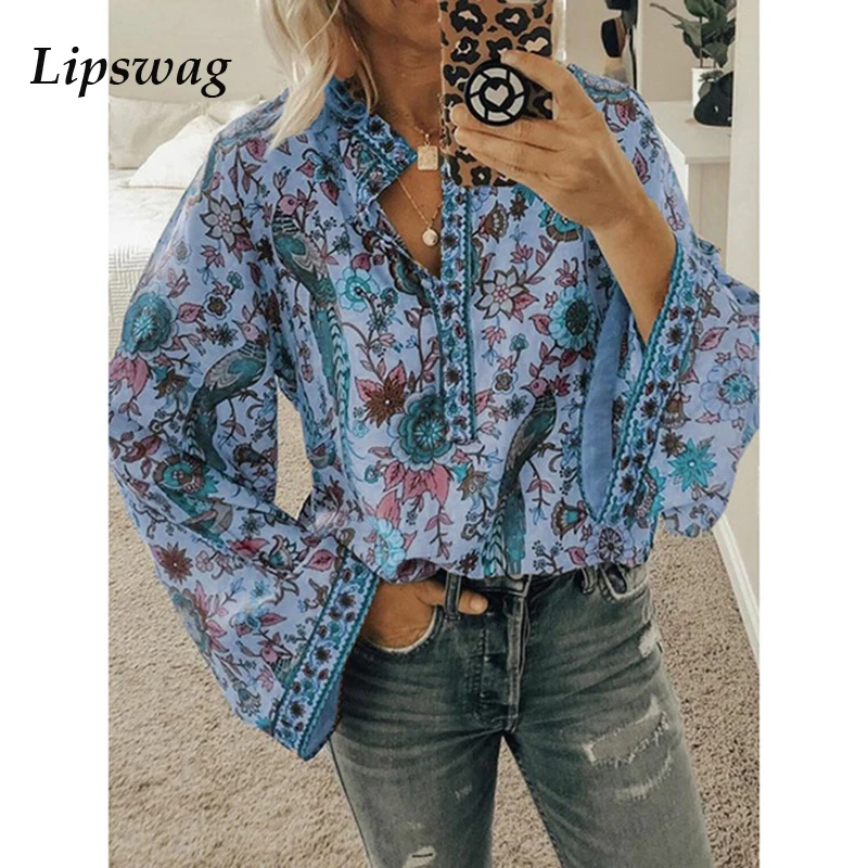 Женская блузка с павлиньим принтом Lipswag, Повседневная Блузка с длинным рукавом и v-образным вырезом, лето-осень 2019