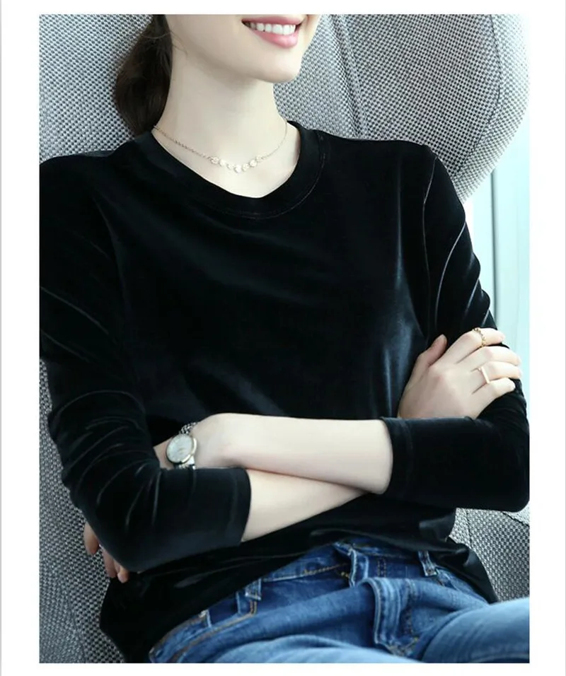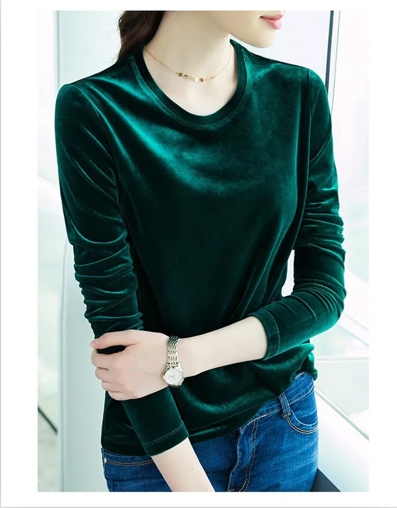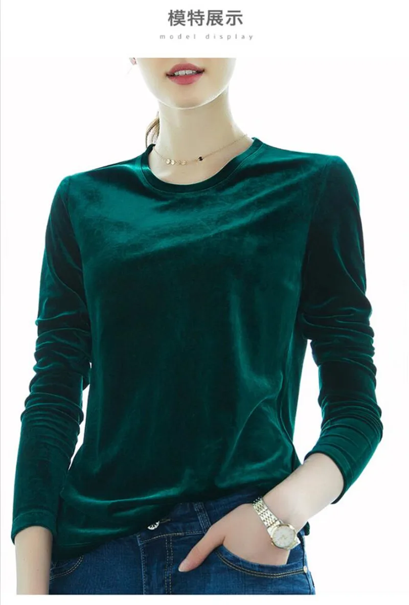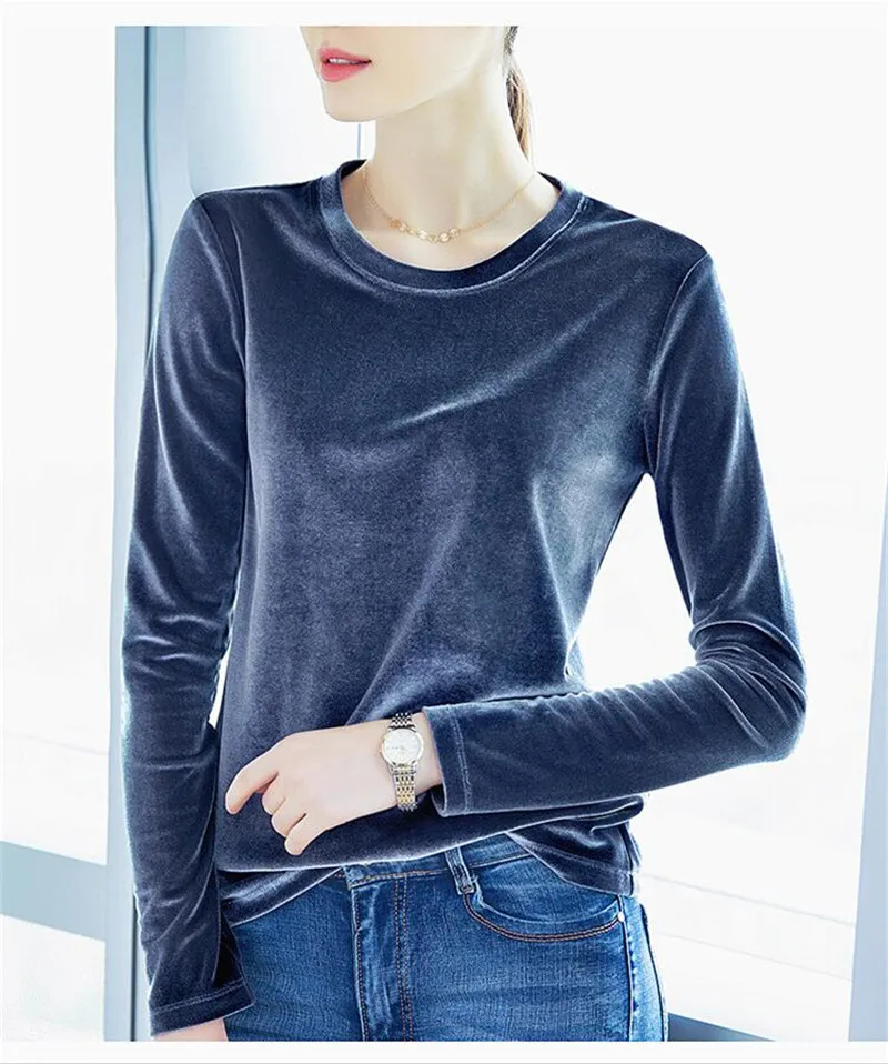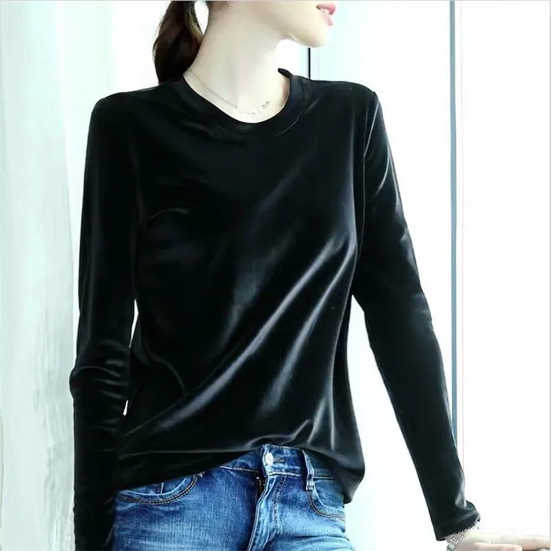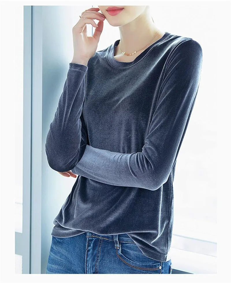 Женские бархатные топы с круглым вырезом, женские футболки с длинным рукавом, сезон весна-осень 2022, однотонная велюровая Базовая рубашка