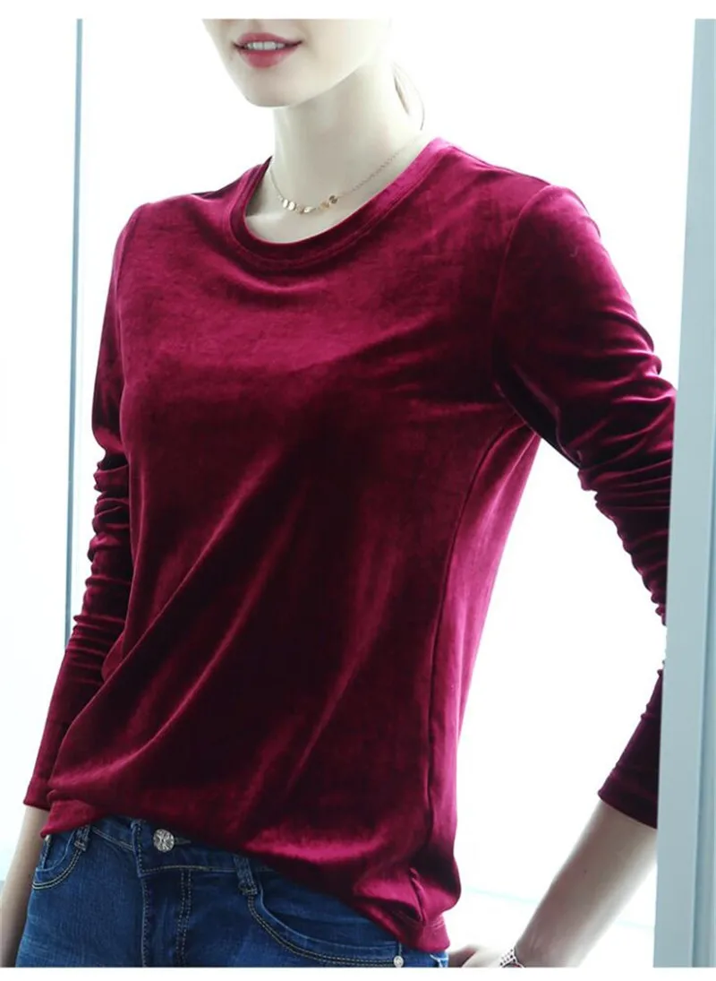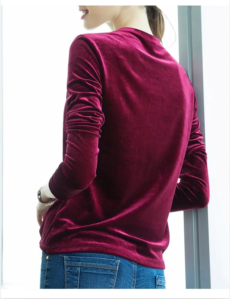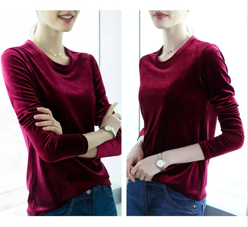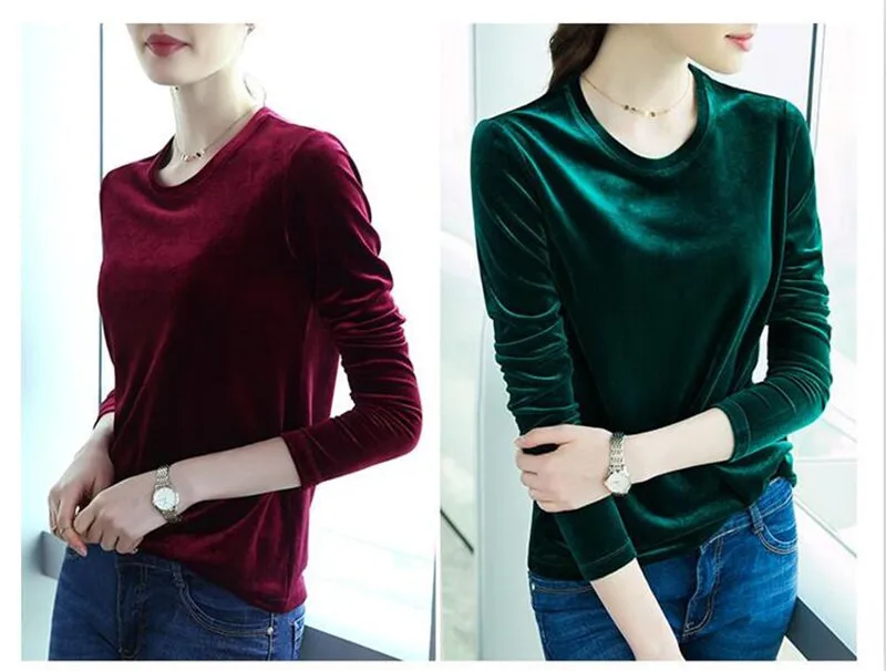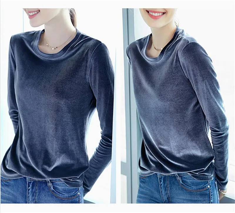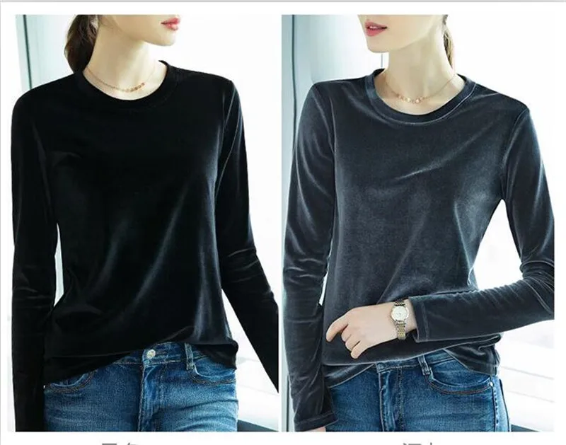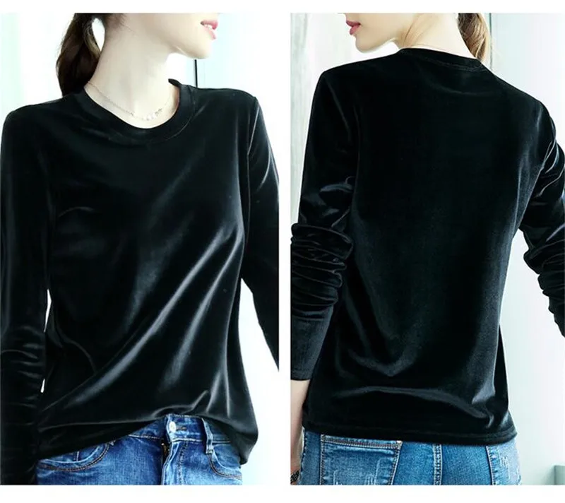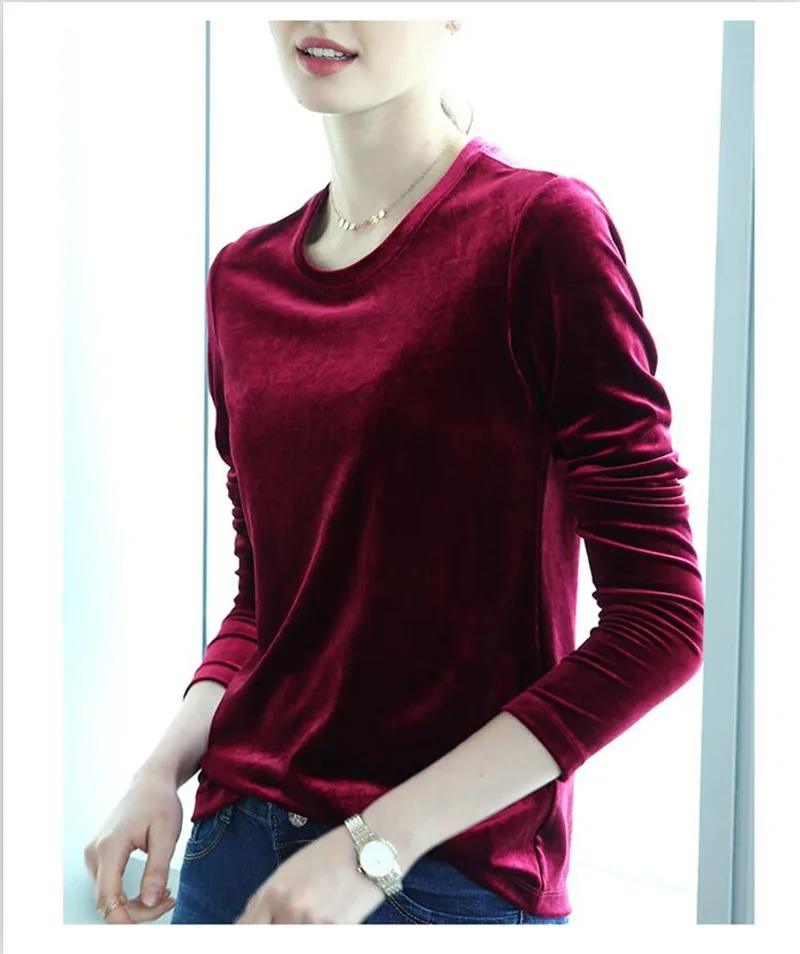 Женские бархатные топы с круглым вырезом, женские футболки с длинным рукавом, сезон весна-осень 2022, однотонная велюровая Базовая рубашка