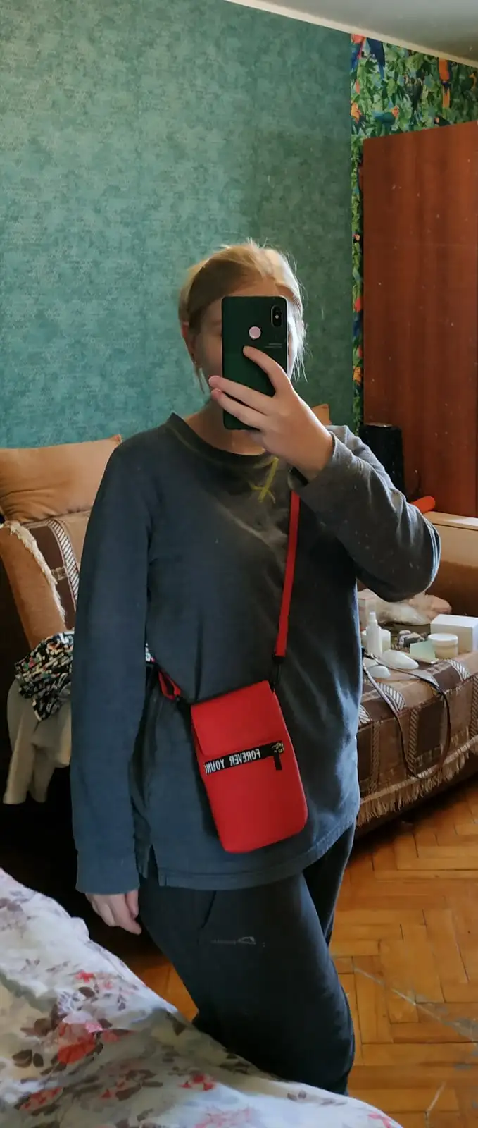Хорошая сумка, одно отделение внутри, и одно маленькое снаружи, закрывается на магнитную кнопку; ремешок регулируется, карабинчики пластиковые, с виду слабые, но сильно зажаты, посмотрим какая выдержка будет. Смартфон в 16 см в длину и 7,5 см в ширину влез отлично, деньги и ключи вмещаются, жалко что разделения внутри нет, чтобы ключи телефон не царапали.