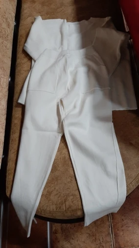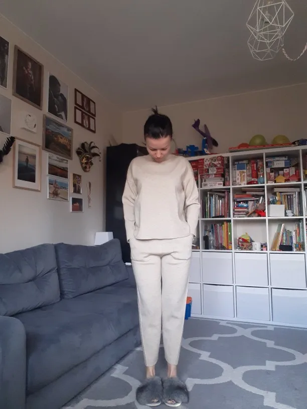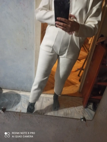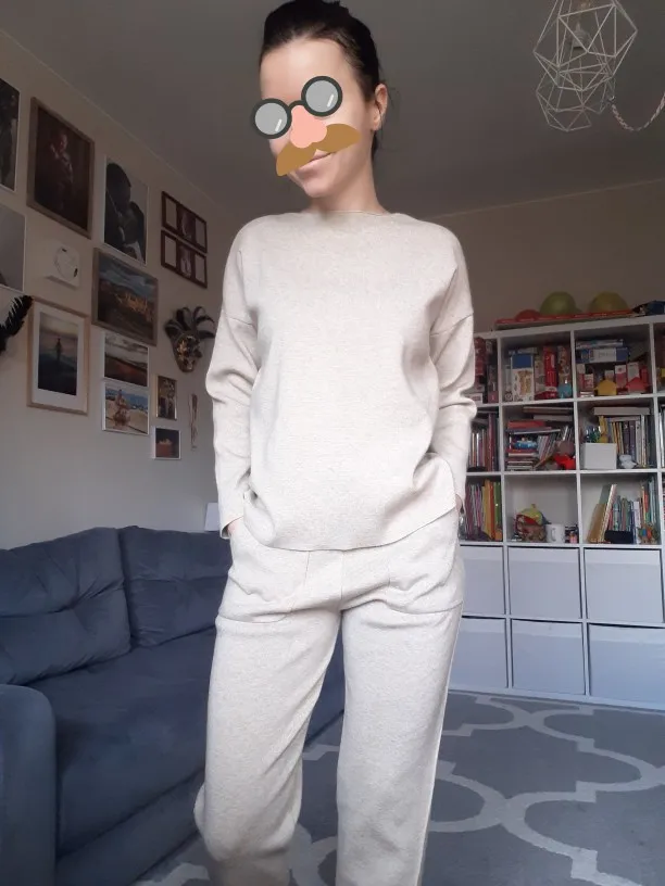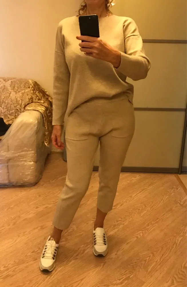На деле костюм не такой как на фото. На фото - мягкий, "уютный" материал, который хорошо ложиться на тело. Пуловер органично смотрится в заправленном виде. А по факту материал более грубый, кажется, там и хлопка нет - одна синтетика. На теле стоит колом. Я худая (42 кг), и рост 158см. На даме раза в 2-3 больше, возможно, будет смотреться более благородно. Пуловер на 2 размера больше, т е длиннее, чем нужно, а брюки укорочены, по щиколотку, длинный верх и укороченный низ делаю фигуру не пропорциональной. Сшит добротно. При этом не понятно, можно ли укоротить кофту, т к швов на обрезах нет (если сделать, будет толсто и некрасиво), ткань с трикотажным плетением, возможно, будет распускаться. Бесплатный возврат не заявлен, так бы вернула. Ну буду дома ходить.