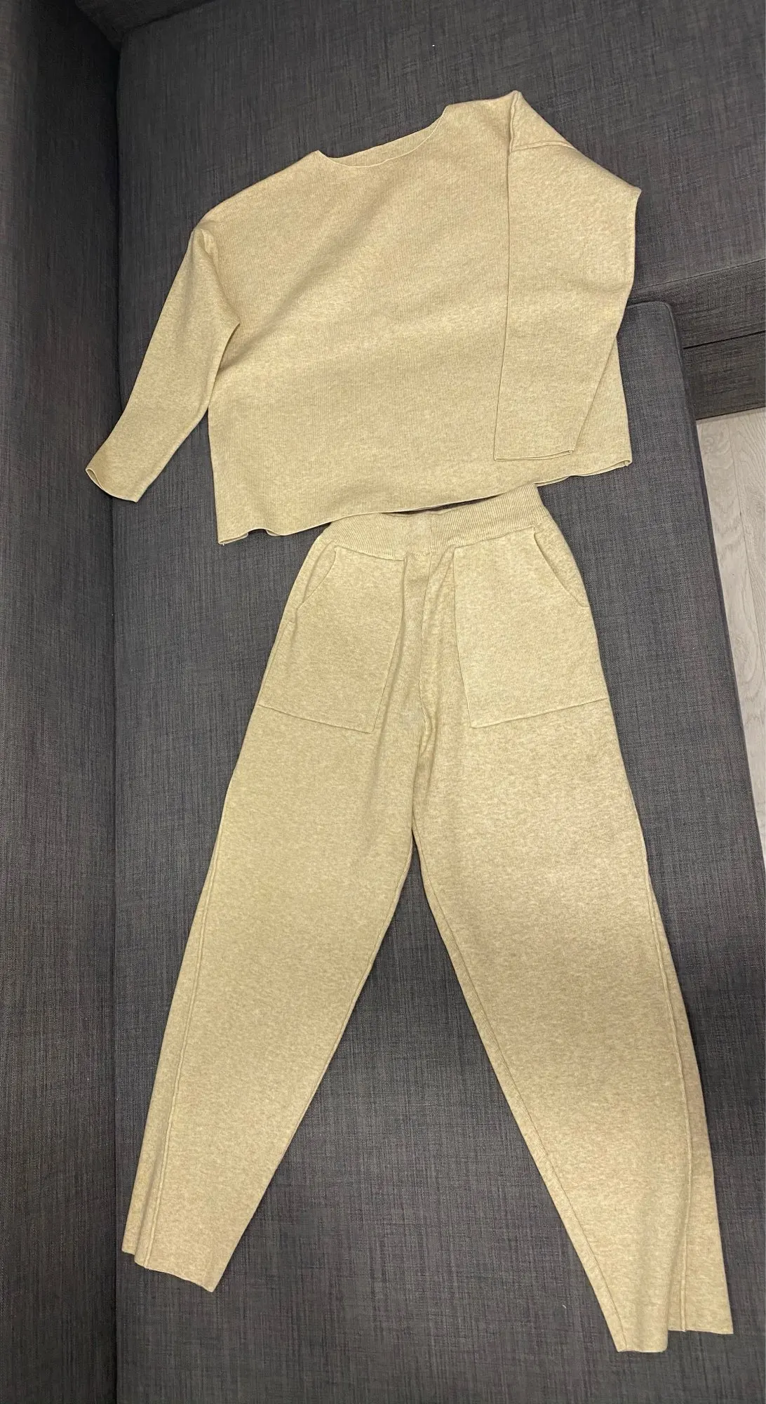 Хороший костюм! По поводу размера не уверена, на костюме нет бирок. Заказала размер L. Мои параметры: рост 170 см., ОГ 93 см., ОТ 72 см., ОБ 100 см. В кофте длинны рукава не хватает сантиметров на 5. Штаны мне, как бриджи. Но костюм всё равно понравился) Увесистый материал, тёплый. Аккуратно сшит. Очень приятный цвет "oatmeal"