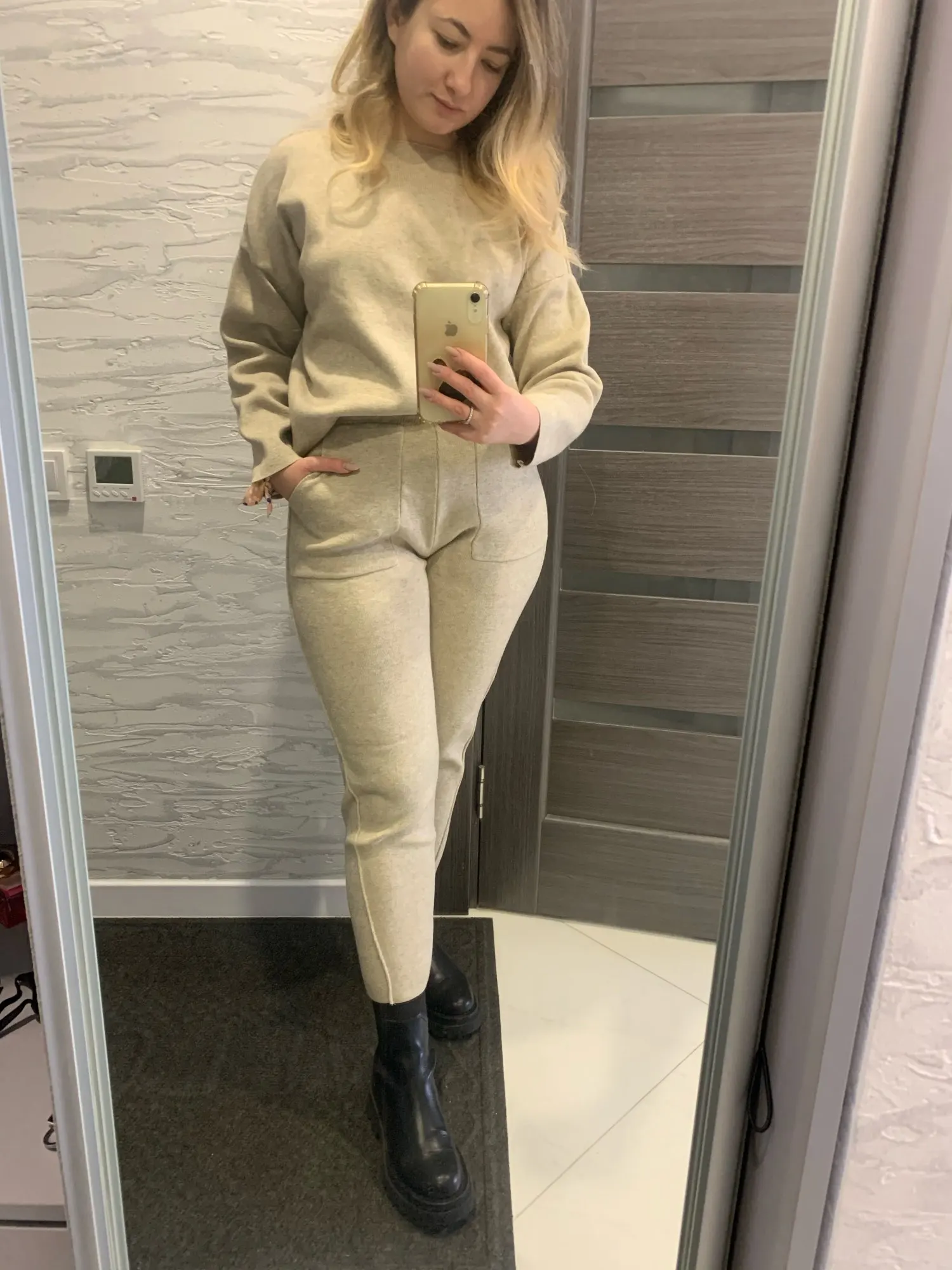 Очень красивый костюм, плотный, бежевый очень светлый, ближе к слон. кости. На рус 44 идеально (на больше - будет не красиво, брюки не в облипку, смотрятся прилично; свитер - оверсайз) . Рекомендую