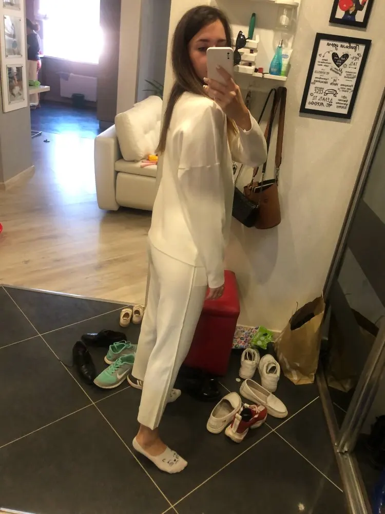 костюм хорошего качества, но на мой 42 российский размер взяла M и штаны в обтяг, и короткие, совсем не так как на моделе, кофта оверсайз