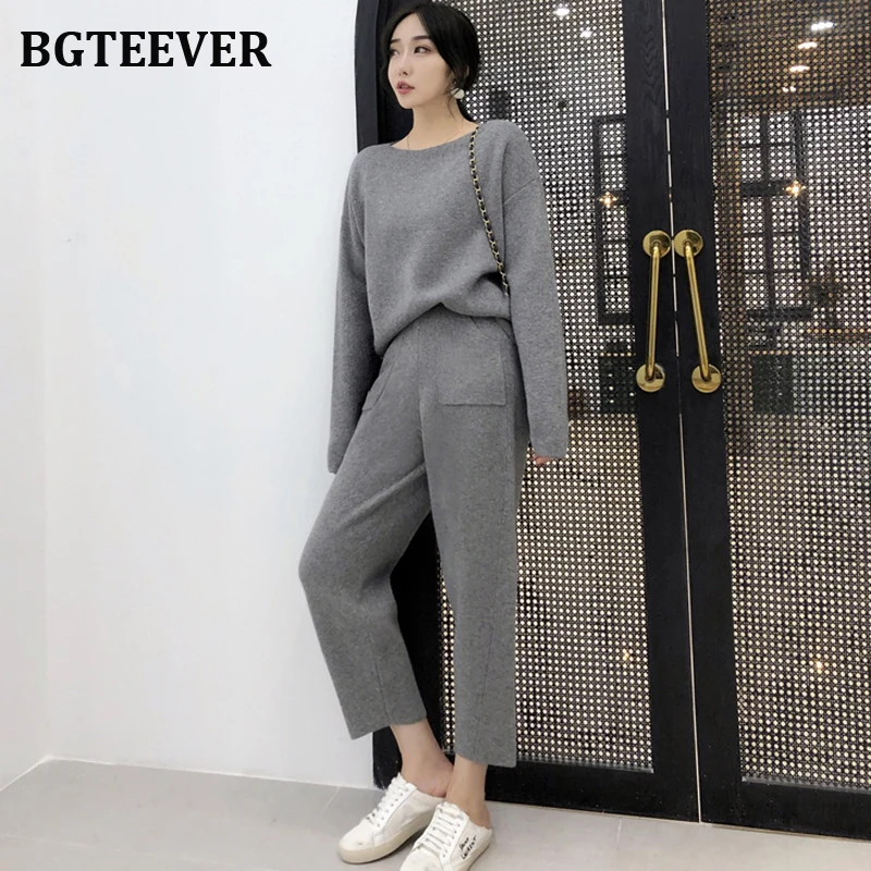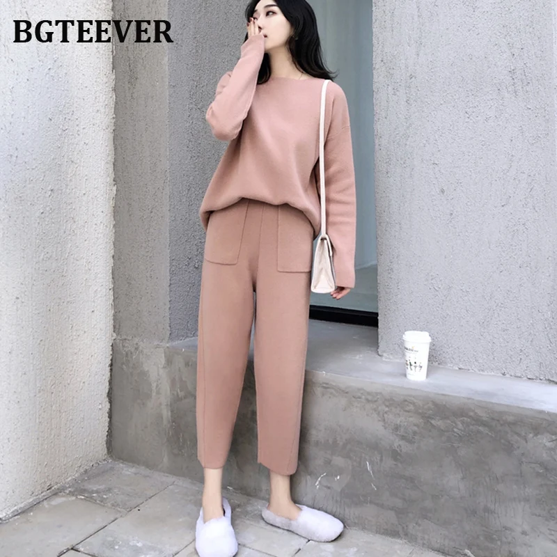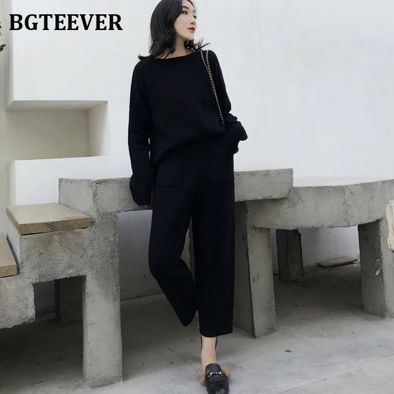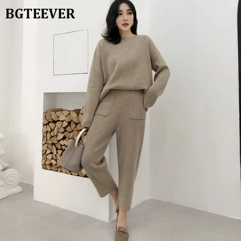 Свитер женский трикотажный, с круглым вырезом и штаны с высокой талией, Осень-зима