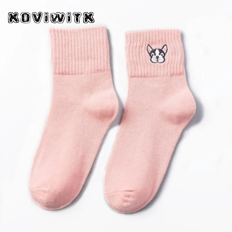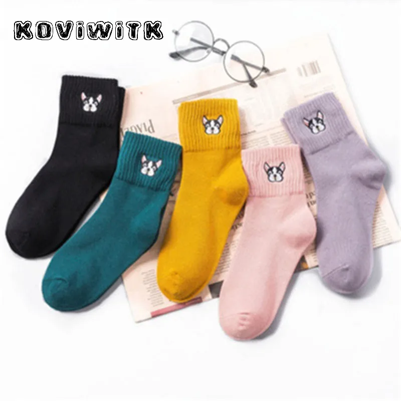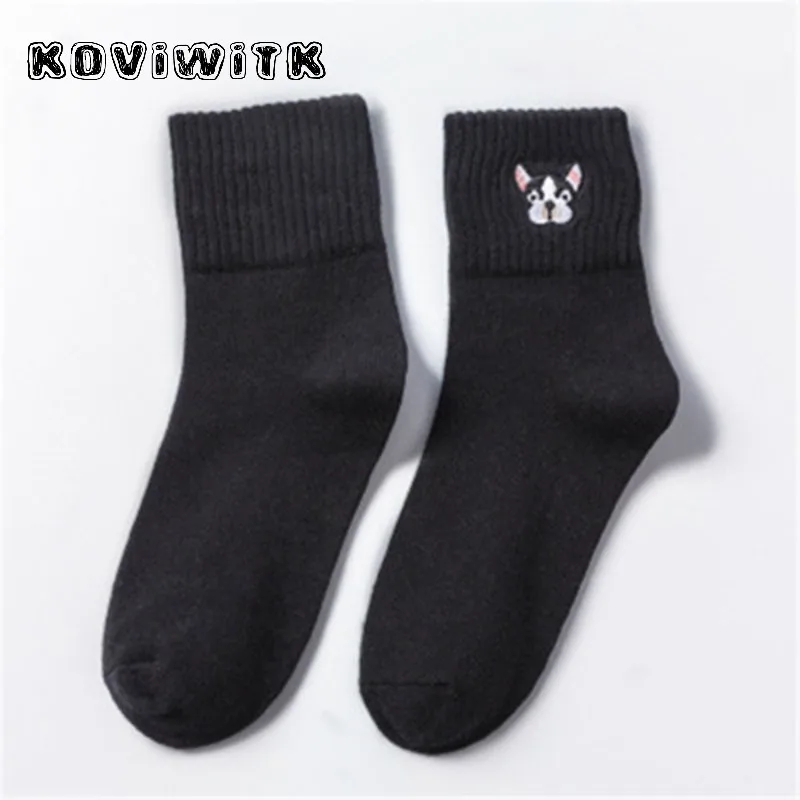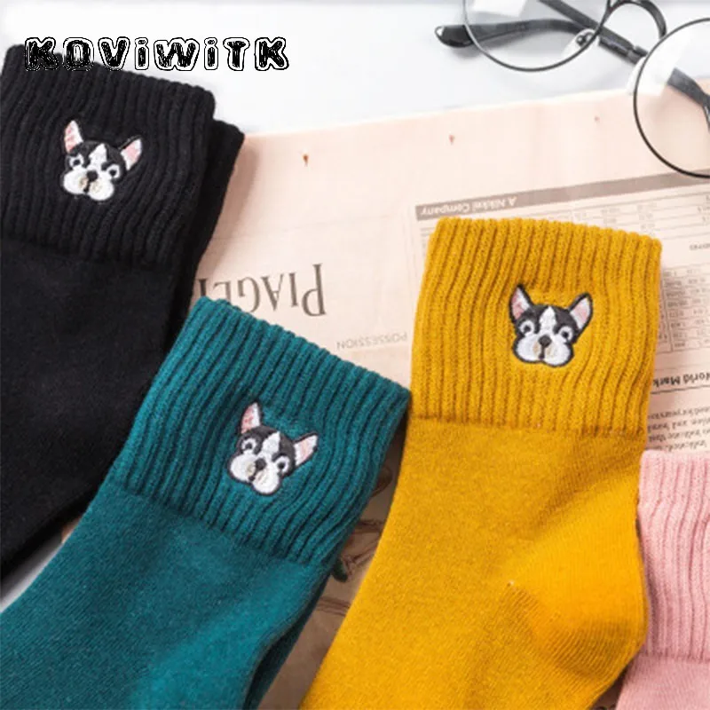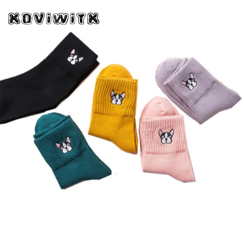 Милые вязаные хлопковые носки с вышивкой французского бульдога, пять цветов, зимние осенние теплые носки, Прямая поставка, женские носки в стиле Харадзюку с изображением мопса для женщин