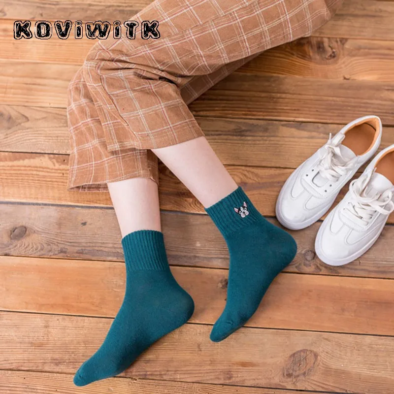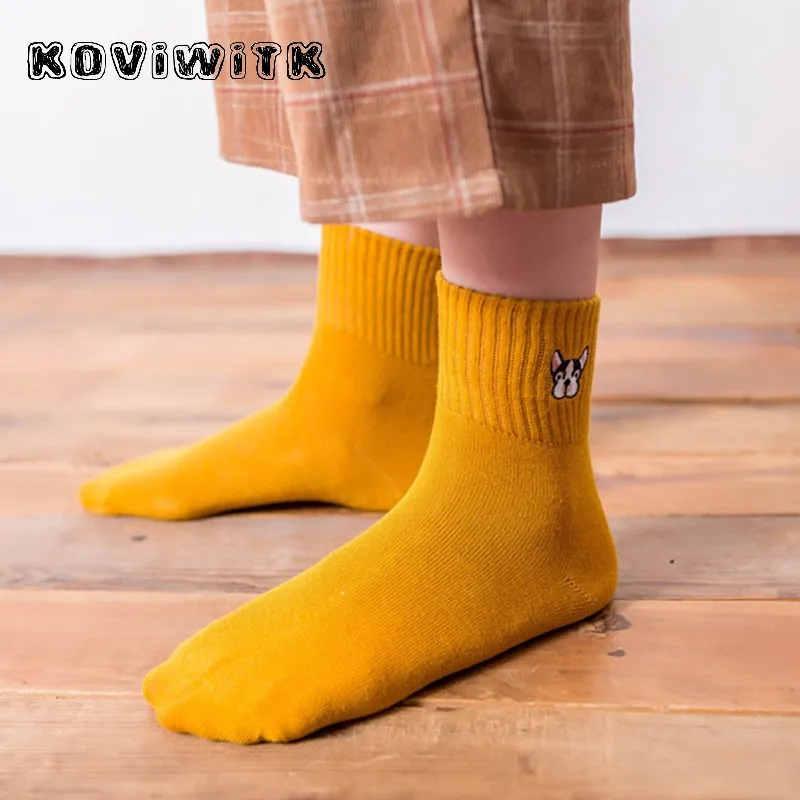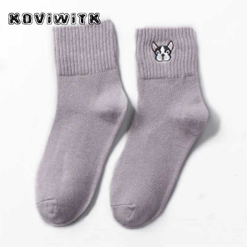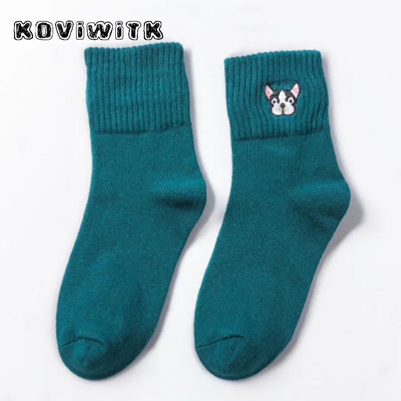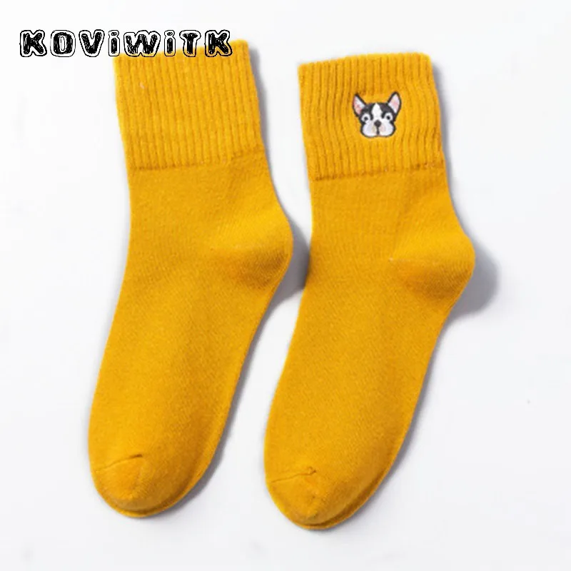 Милые вязаные хлопковые носки с вышивкой французского бульдога, пять цветов, зимние осенние теплые носки, Прямая поставка, женские носки в стиле Харадзюку с изображением мопса для женщин