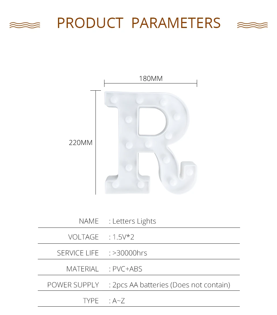 Характеристики:Светодиодный светильник в ночное время: праздничный светильник с буквами алфавита A-ZЦвет корпуса: белыйСветильник; Цвет: теплый белыйСветильник источник света: светодиодныйРазмер: 225*185 мм, измеряется человеком, маби имеет погрешность 1-3 см.Аккумулятор: 2 * AA (не входит в комплект)Посылка: 1 * светодиодный светильникОсобенности:1. Создайте теплую и романтическую атмосферу, теплое белое светодиодное освещение.2. Используется в качестве повседневного домашнего декора, отлично подходит для картин, окон, двора или как фото/набор реквизитов.3. Привлекают внимание и привлекают внимание как верхушка вашей свадьбы, вечерние, специальные мероприятия и т. Д.Примечание:1. Может быть немного наклонено вправо, когда буква D стоит на рабочем столе.2. Из-за буквенного освещения в различных партиях, поэтому освещение может быть сильным или слабым. Надеюсь, вы сможете понять.3. Нужны 2x батарейки AA (не входят в комплект)4. Можно повесить на стену или поставить на плоскую поверхность!5. Буквы сделаны вручную. Некоторые буквы имеют небольшой дефект. Они приемлемы.