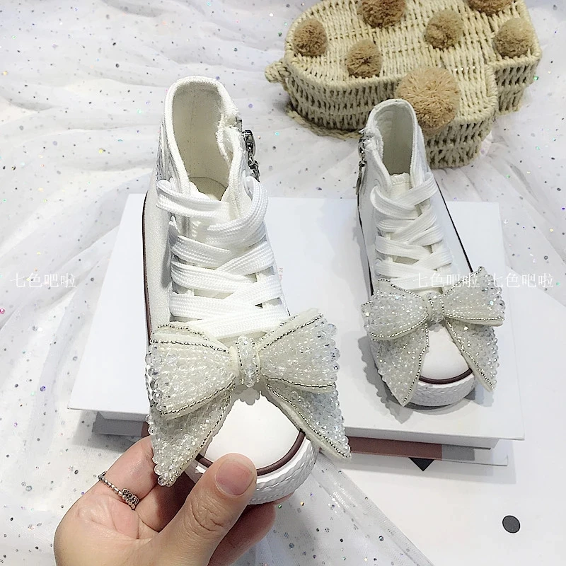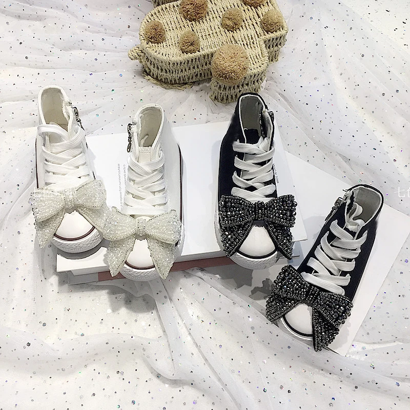 Новинка, осенние детские повседневные кроссовки, холщовая обувь с бантом для маленьких девочек, детские кроссовки, брендовые высокие кроссовки для малышей