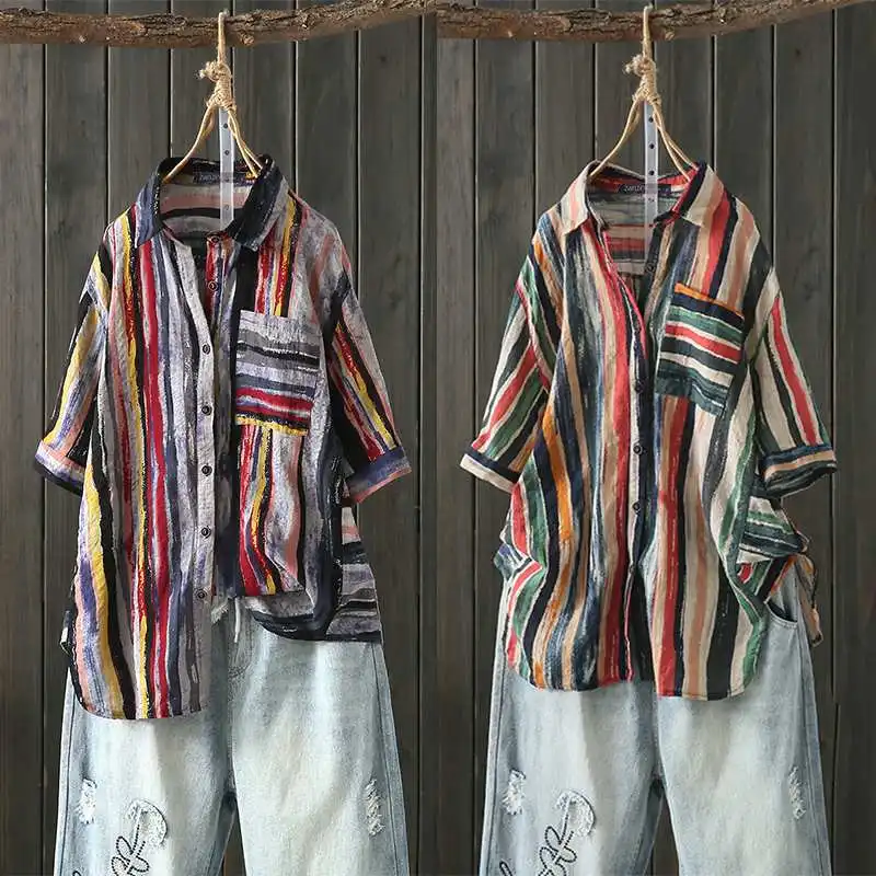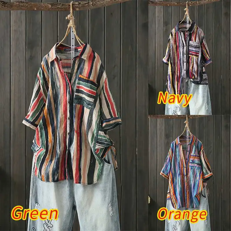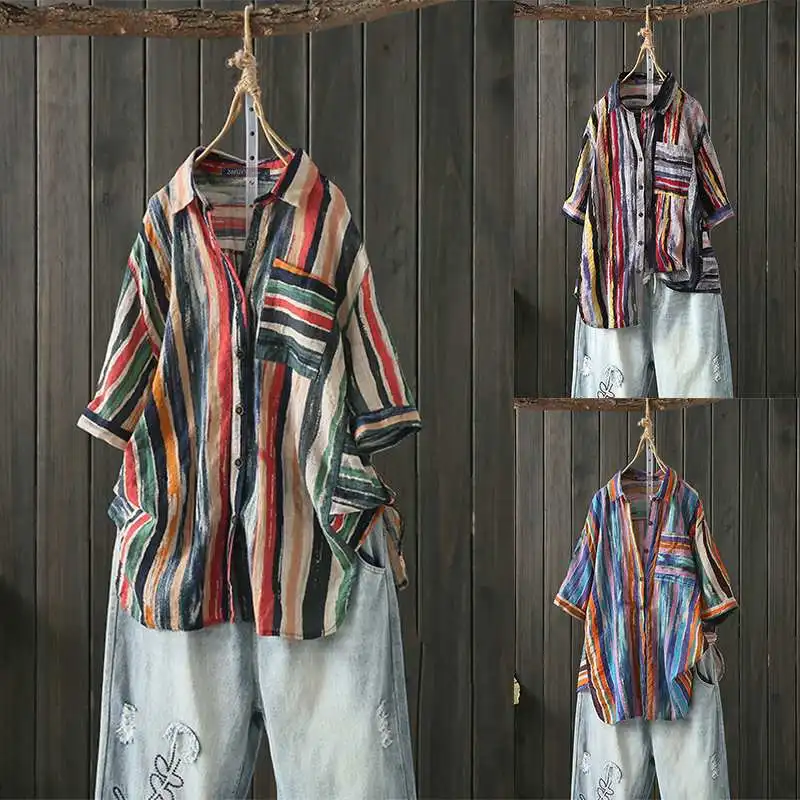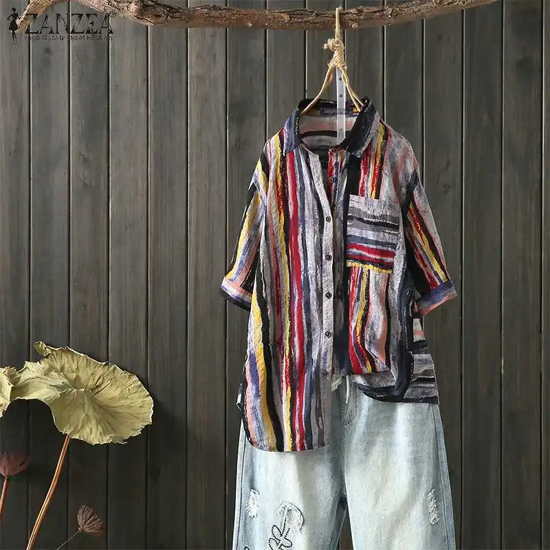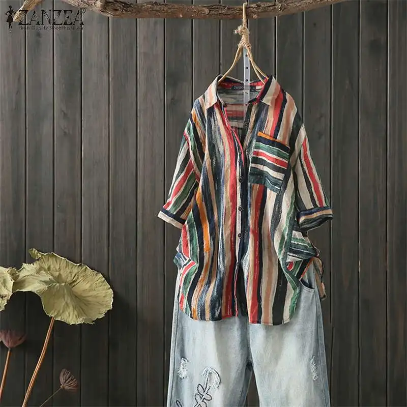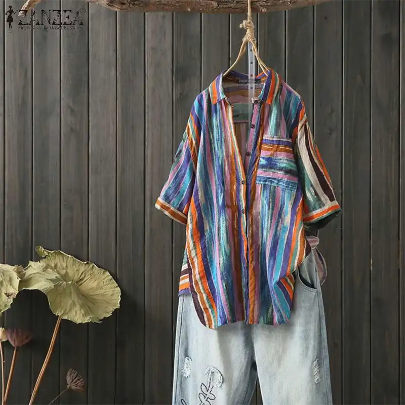 ZANZEA Женская полосатая блузка, летняя винтажная блузка с отложным воротником и пуговицами, рубашка с коротким рукавом, туника 5XL
