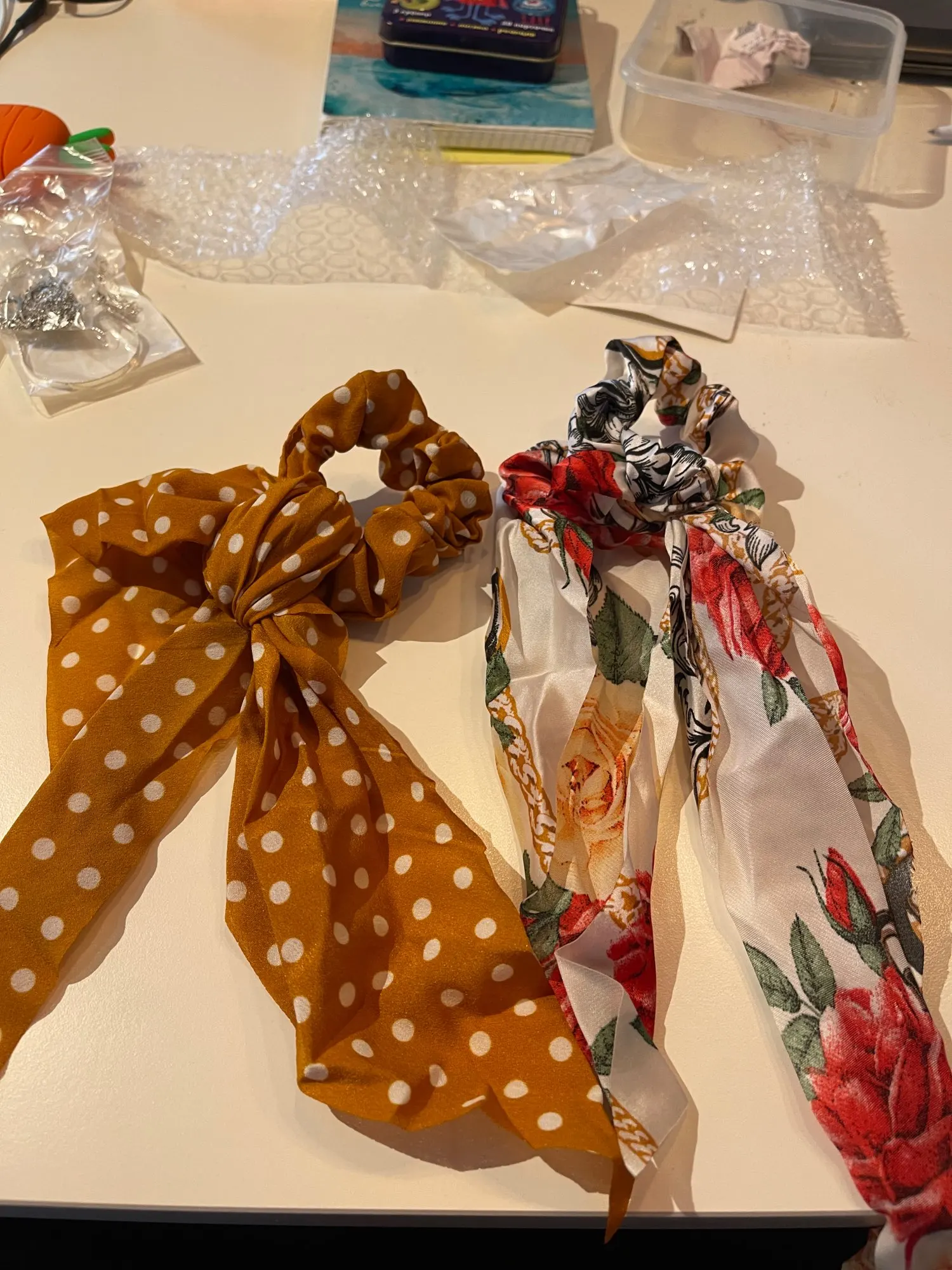 Заказ пришёл в течение 2 недель в Москву. Резинки с лентами пришли жутко мятыми и с неровными торчащими нитками. После разглаживается утюгом и обработки краев бантик приобрёл нормальный вид. Плюс имеются пятна на одном из бантиков.