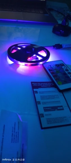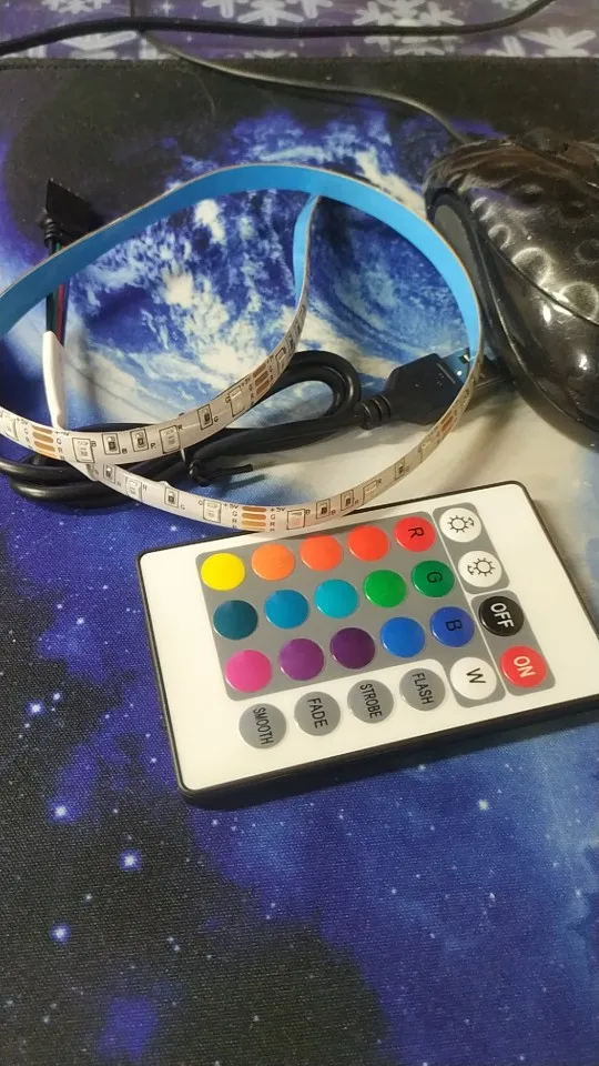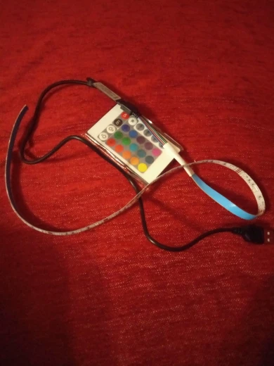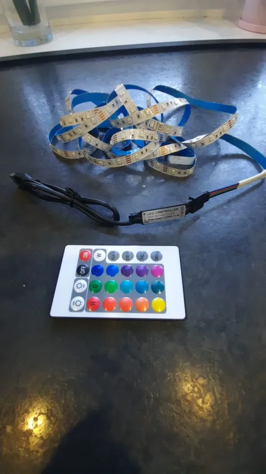 Быстрая доставка! Всего 17 дней прошло от заказа до доставки. Покупала со скидкой, за 41 руб. 1 метр светодиодной ленты RGB неводопроницаемую для внутренних помещений для TV . В комплекте также есть пульт, контроллер. Чтобы запустить нормально нужно правильно соединить контроллер с лентой. По входу будет совпадать в любом случае, если её переворачивать, но заработает только с одной стороны. По этому, если думаете что ваша лента не рабочая, просто переверните контроллер вниз и снова соедините. В пульте батарейки нет. Для пульта нужна одна большая круглая батарея на CR 2032 3V. Чтобы открыть крышку от пульта, тоже пришлось немного повозиться. Защелку нужно двинуть в правый бок, удерживая, открыть вниз крышку. По умолчанию без пульта может светиться синим цветом при первом запуске, но если она была по умолчанию выключена, то при первом запуске мигнет один раз цветом RGB и потухнет. Пультом получилось настроить как нужно. Есть 4 режима перехода цветов: два быстрых и два плавных.