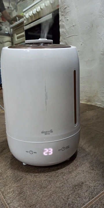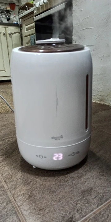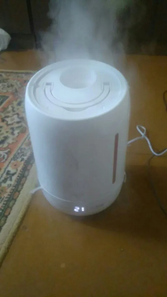 Наконец получили наш увлажнитель. Заказывали 01.12, забрала 10.12. Пришёл целый и невредимый, в комплекте шёл переходник для европейской вилки (мы его сначала не увидели, подумали, что не тот отправили). Работает очень тихо, можно смело оставлять на ночь. Резервуар для воды надо будет придумать, как тщательно вычищать, так как отверстие небольшое, рука туда не пролезет. Но это ерунда. Три уровня подачи пара, фото с максимальной подачей, пар не оседает конденсатом. Нам пока все очень нравится Инструкции на русском (даже английском) не было, была только на китайском. Но это не проблема, за минуту скачали из интернета на русском по названию модели. Функционал управления очень простой и понятный. Хороший и бюджетный увлажнитель.
