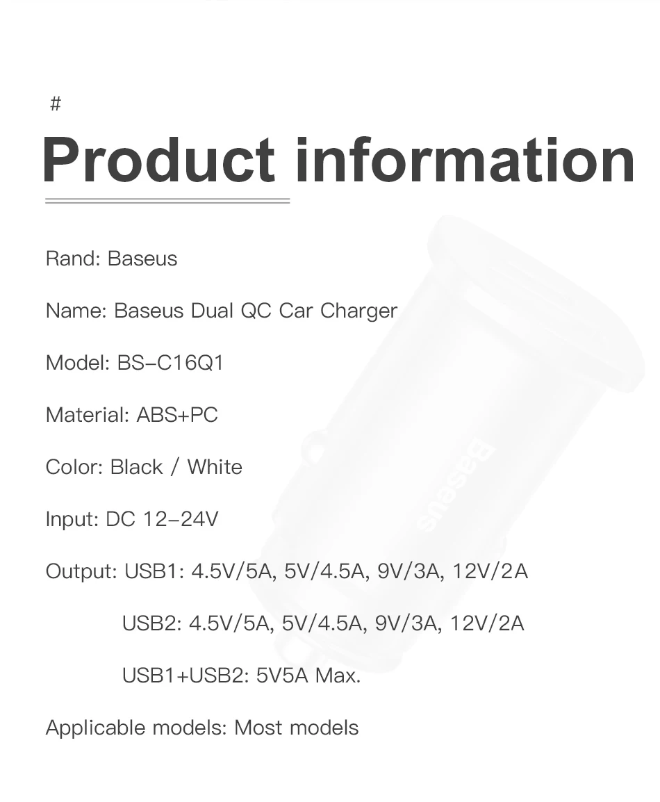 Зарядное устройство Baseus автомобильное с двумя USB-портами, 5 А, 12-24 В