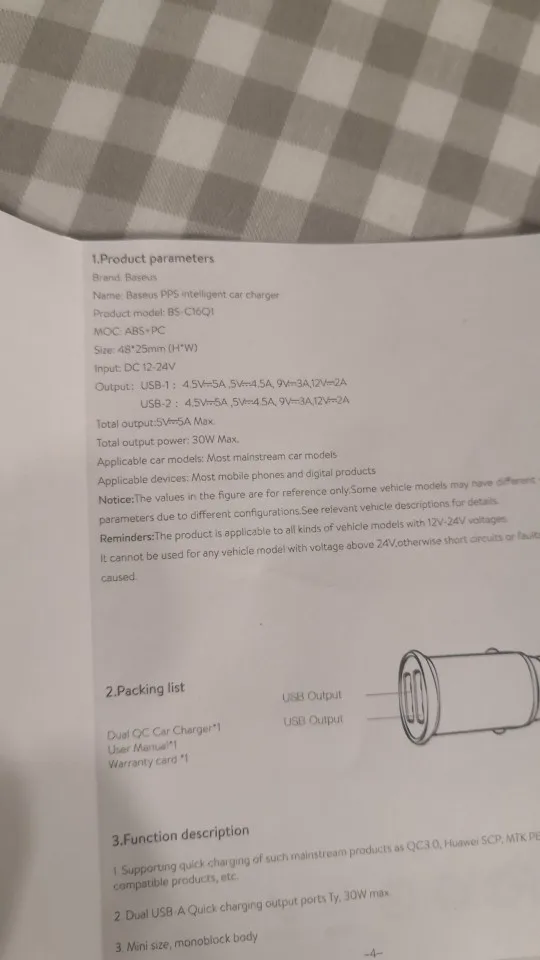 Упаковка красивая, отверстия тугие - точно не выпадет никакой шнур. Зарядка работает. Быструю зарядку ещё не проверял. Торчит примерно на 1 см из гнезда на Ауди а1. Доволен, можно брать. Фото не делал, т.к. такой же как на картинке у продавца.