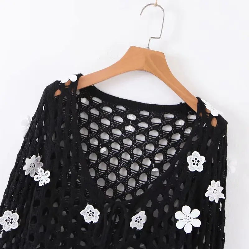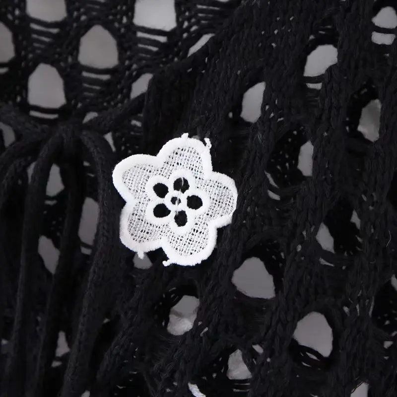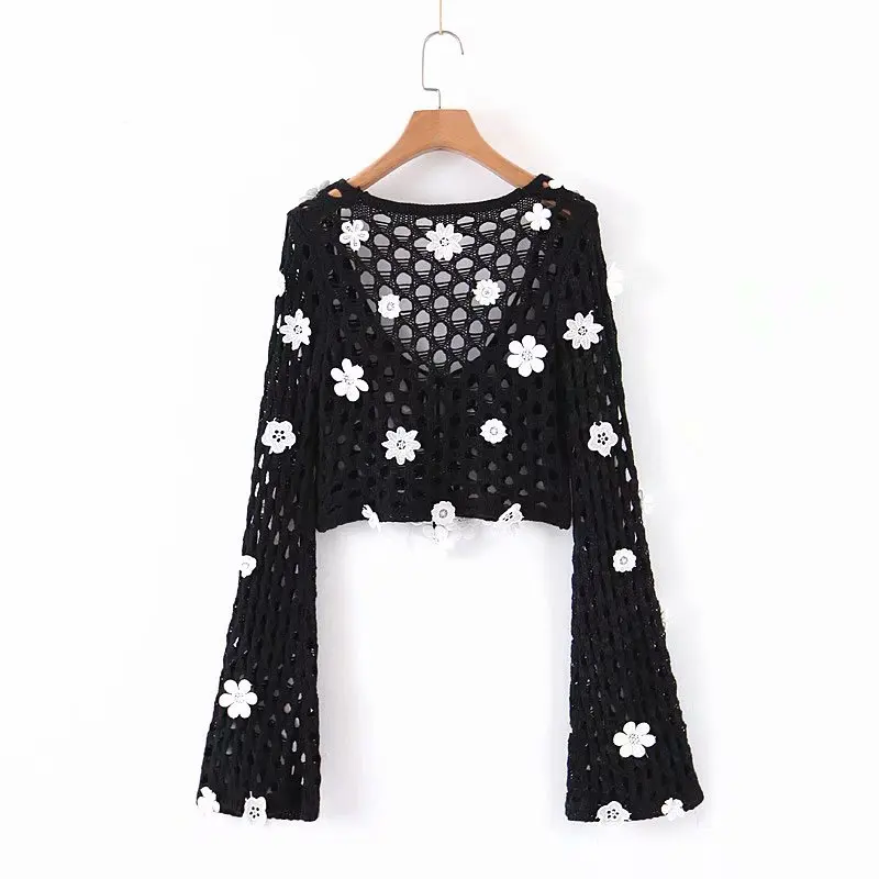 Белый кавайный пикантный свитер с цветочной вышивкой, милый вязаный осенний свитер, кавайный черный пуловер, укороченные свитера для женщин в Корейском стиле