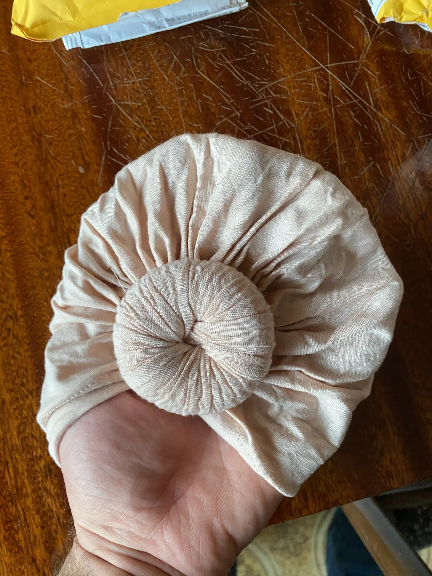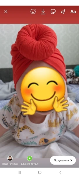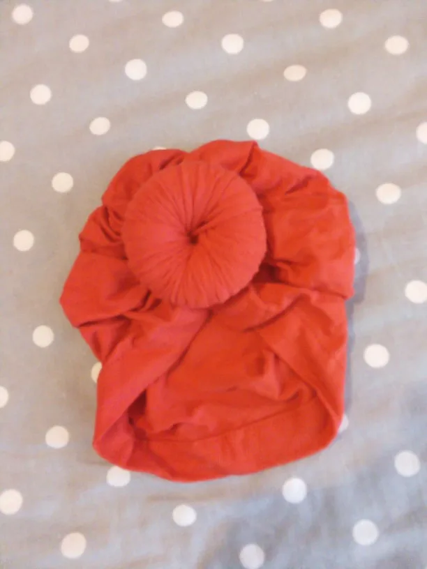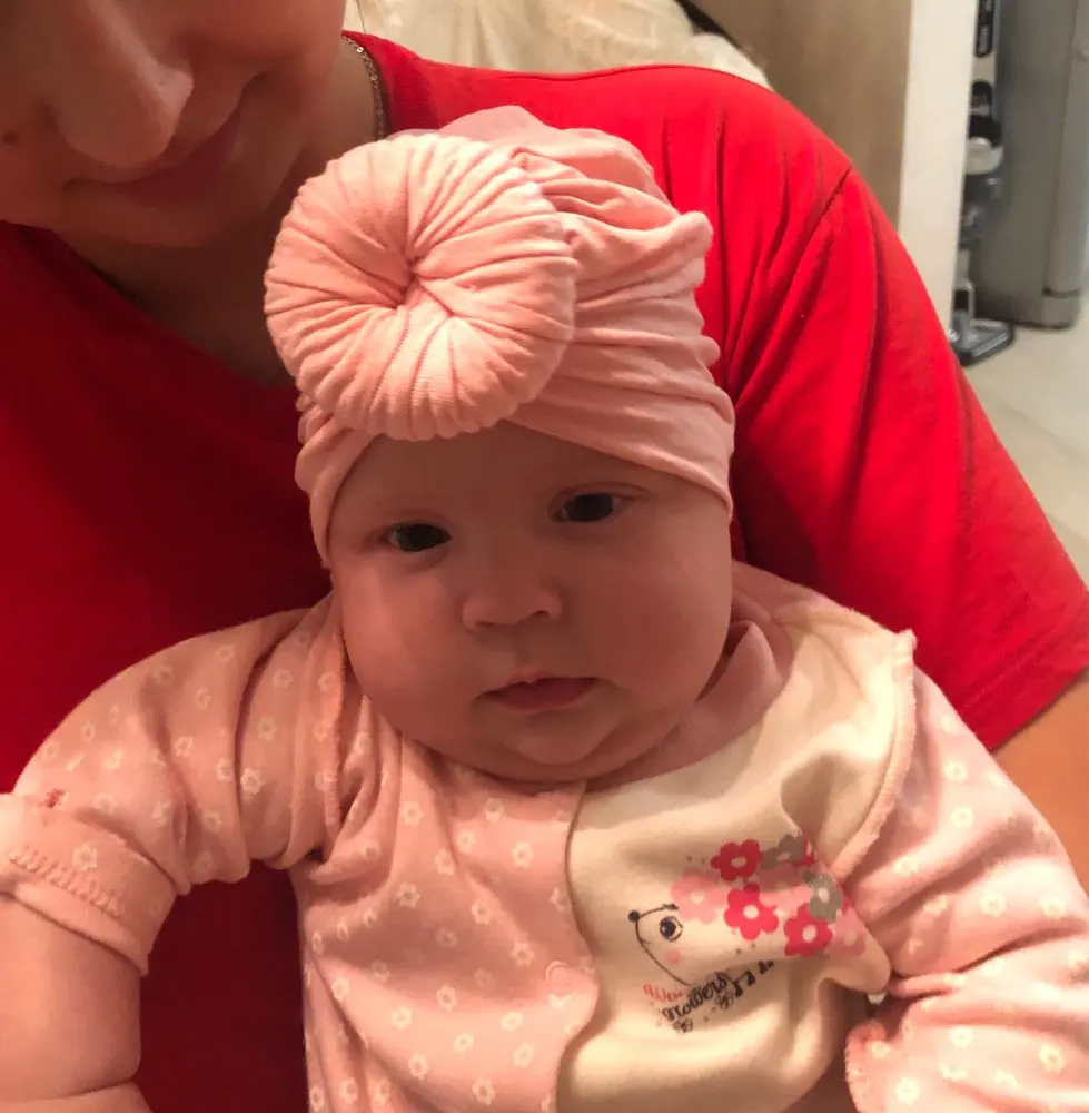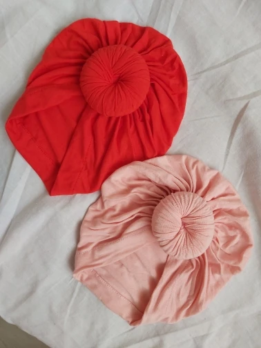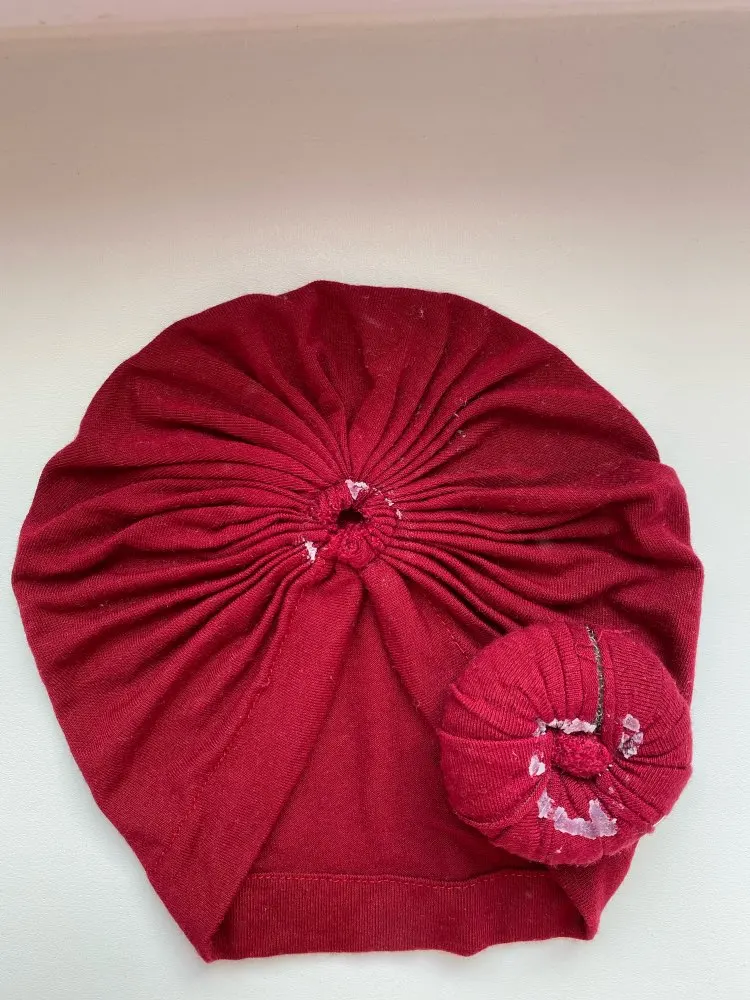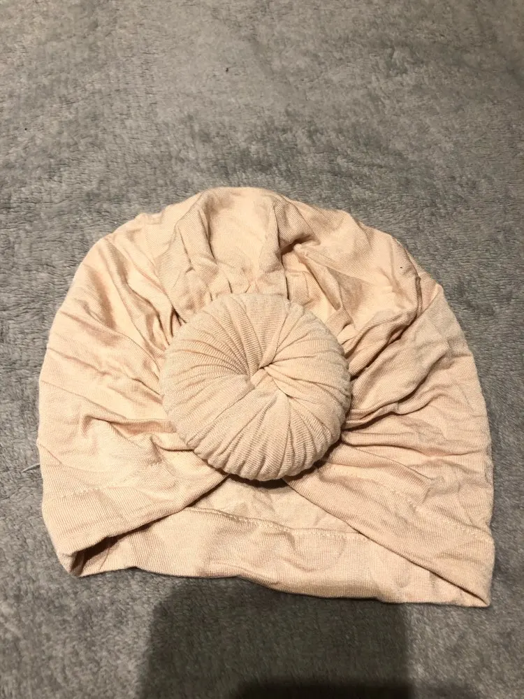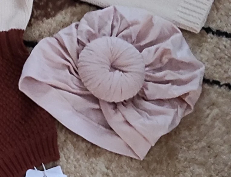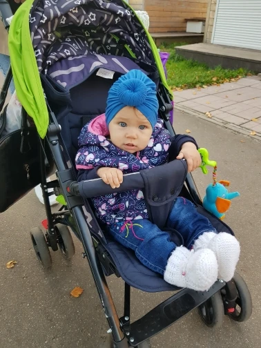 Оооочень классныйтюрбанчик, нам 10 мес, сел отлично, думаю до 2 лет можно носить. Все замечательно. Цвет беж приятный очень. Шарик аккуратный не огросныйг