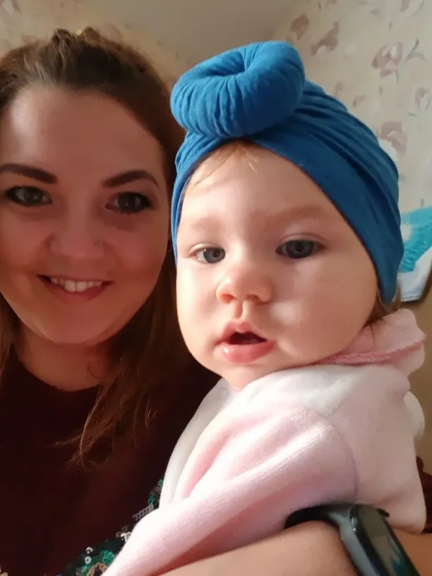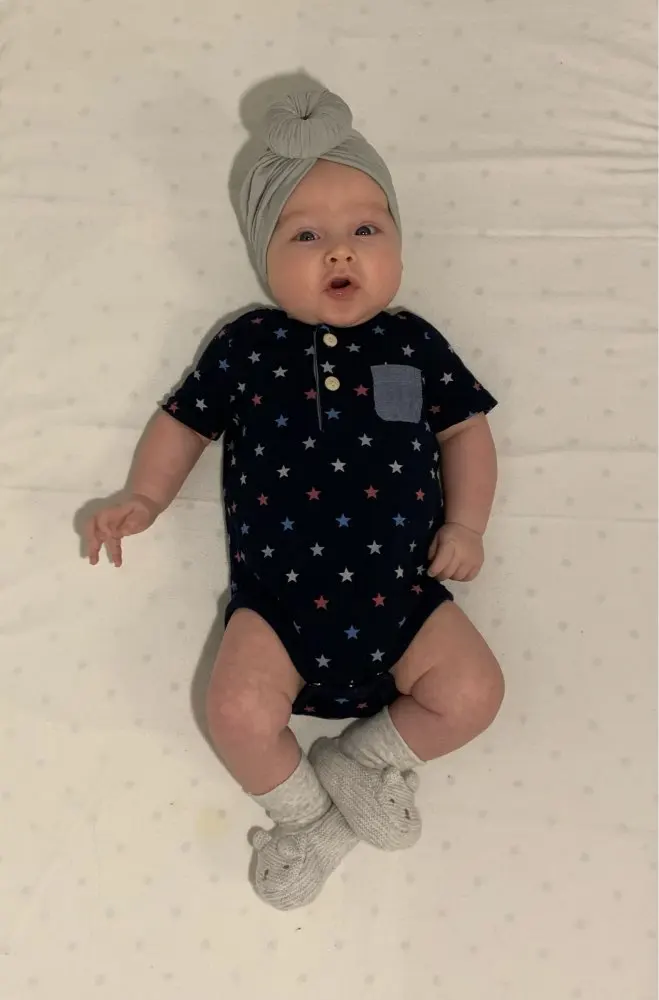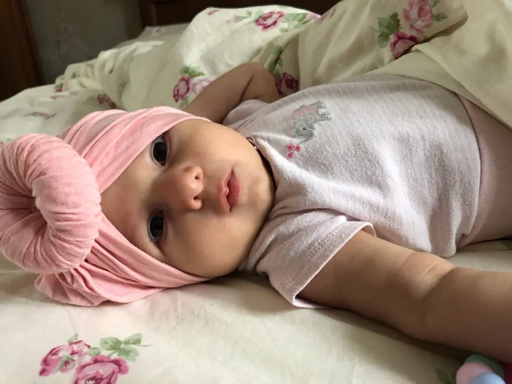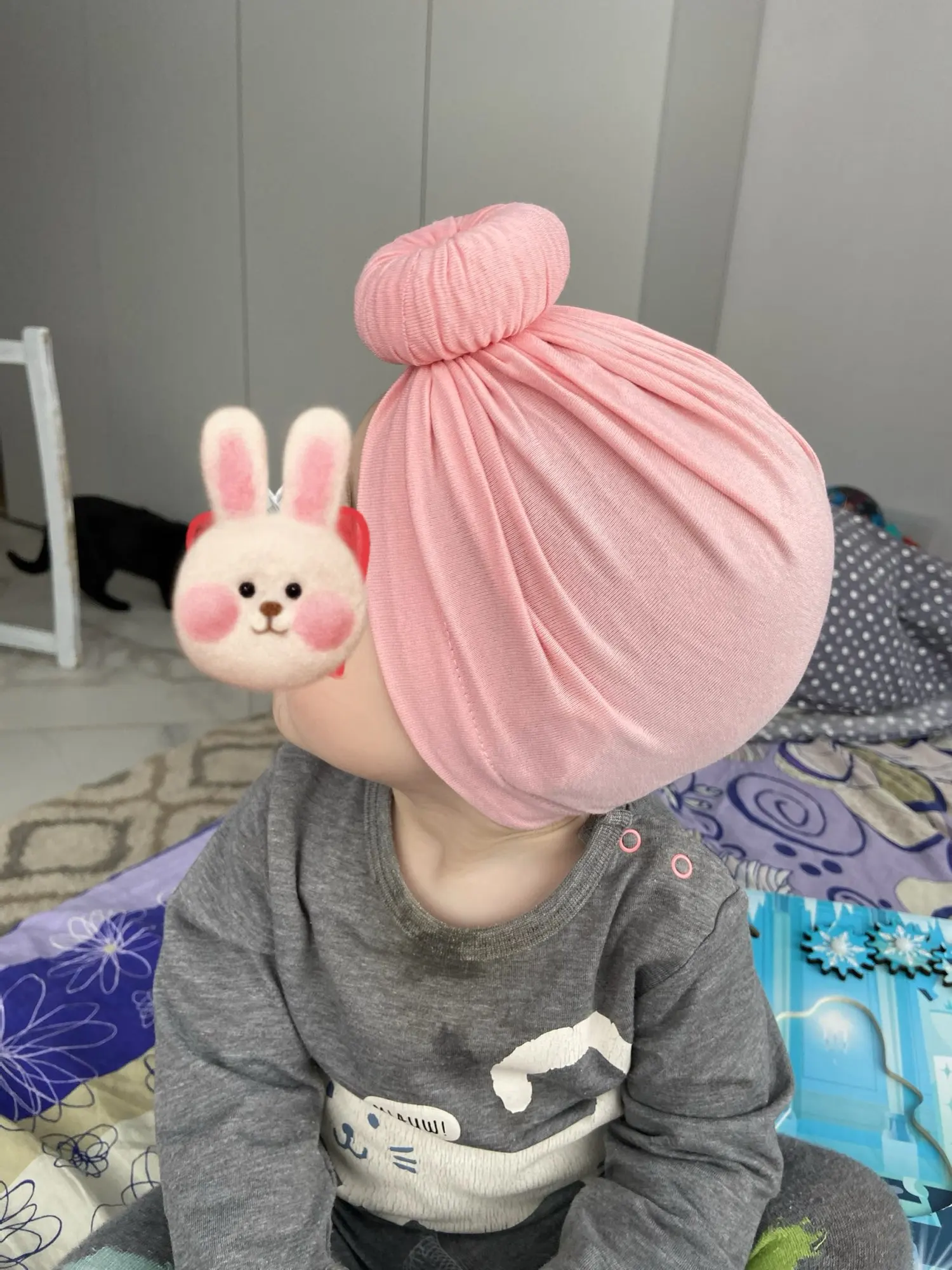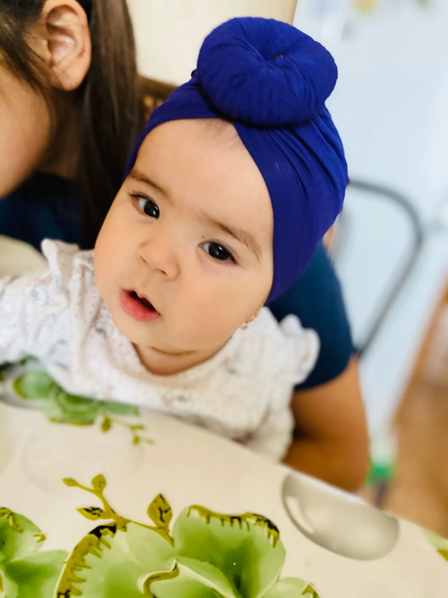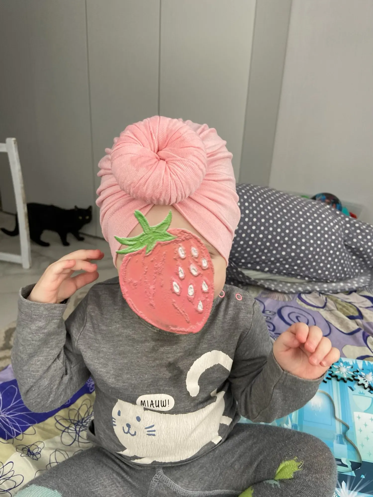 Оооочень классныйтюрбанчик, нам 10 мес, сел отлично, думаю до 2 лет можно носить. Все замечательно. Цвет беж приятный очень. Шарик аккуратный не огросныйг