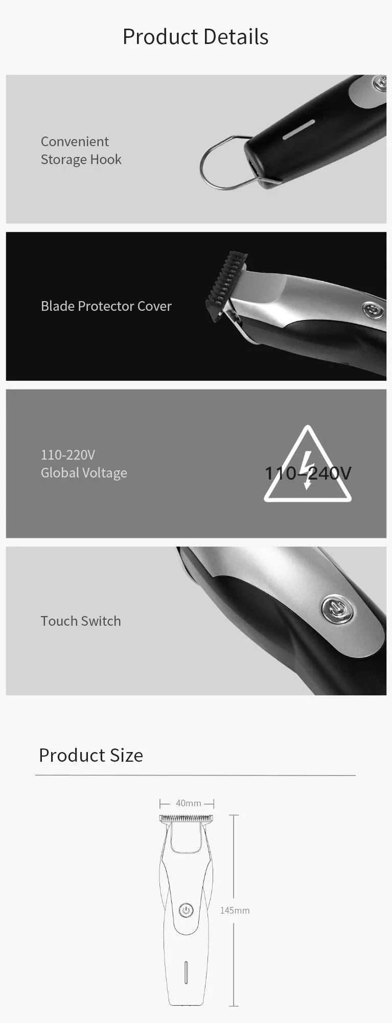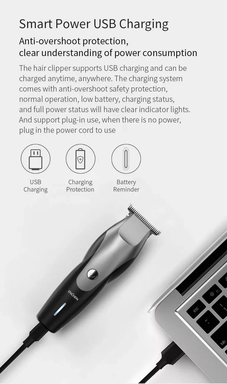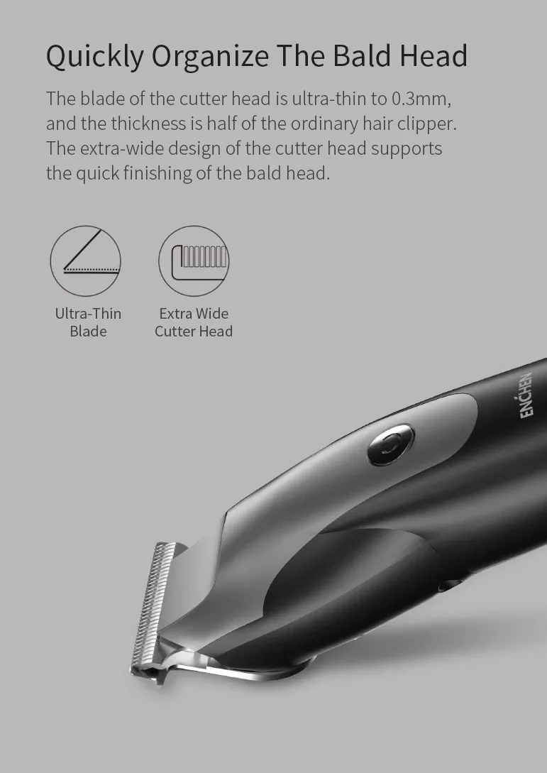 ENCHEN hummingbird предназначен для отделки постепенной прически, поэтому он принимает полностью стальную профессиональную Т-образную режущую головку, ультра-тонкие зубы, ультра-короткий шаг, R-shaped obtuse дизайн угла, и 1-3 мм Концевая расческа, точный контроль длины стрижки, может легко создать эффект градиента
