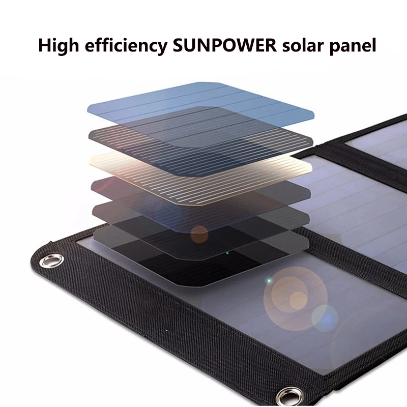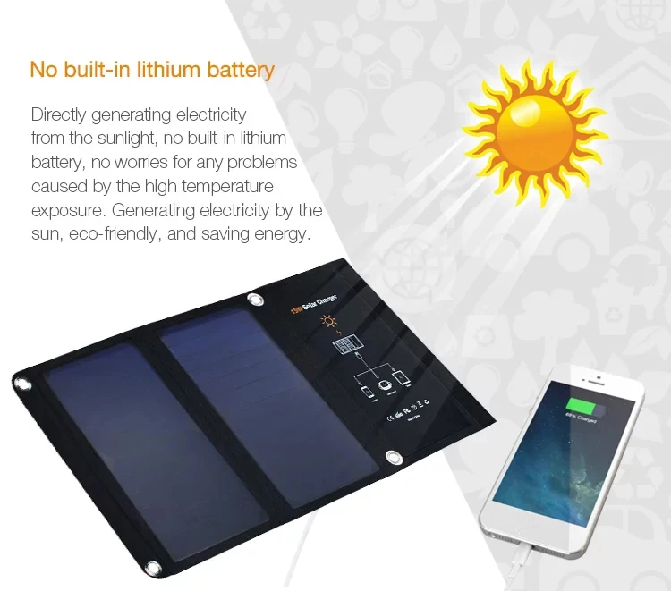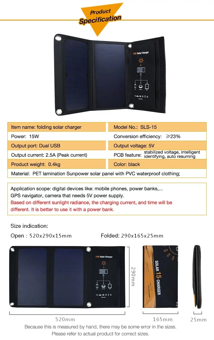 Спецификация:Солнечная панель: 15 Вт (солнечная батарея Sunpower)Складной номер: 2 шт.Эффективность трансформации:>22%Выходное напряжение: 5 В двойной USBВыходной ток: 2.5A Макс.Материал сумки: 600D полиэстерОткрытый размер: 520*290*15 ммРазмер складывания: 290*165*25 ммВес: 0,4 кгЦвет: черныйХарактеристика:Область примененияЦифровые устройства, которым нужен источник питания 5 В, такие как мобильные телефоны, банки питания, камера...Простота в использованииРазверните устройство и выставьте Солнечные Панели мощностью 15 Вт на солнце и вставьте ваши устройства в usb-порт, что позволяет одновременно заряжать до двух устройств, время зарядки зависит от качества и интенсивности солнечного света.Автоматический перезапуск IOSВсякий раз, когда он теряет контакт с прямыми солнечными лучами, он будет временно останавливаться и начинать снова автоматически, как только захватывает солнечные лучи.Не встроенная литиевая батареяЭкологически чистые и не беспокойтесь о любых проблемах, вызванных высокой температурой.Как зарядить устройство:1. Разверните зарядное устройство и поместите панели под прямыми солнечными лучами2. Подключите устройство к солнечному зарядному устройству с помощью usb-кабеля3. Держите устройство прохладным во время зарядки. Поместите его под солнечную панель, в карман солнечной панели или в тени, чтобы избежать перегрева.Примечание:1. Может использоваться только при солнечном свете!2. На основе различных лучей солнечного света, зарядный ток и время будут отличаться.3. При прямых солнечных лучах Этот массив может быть горячим! Будьте осторожны при обращении с ним после длительного времени на солнце.4. Кроме того, убедитесь, что любые устройства, которые Заряжаются от прямых солнечных лучей, так как тепло может повредить их.