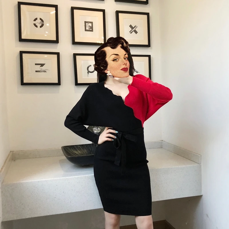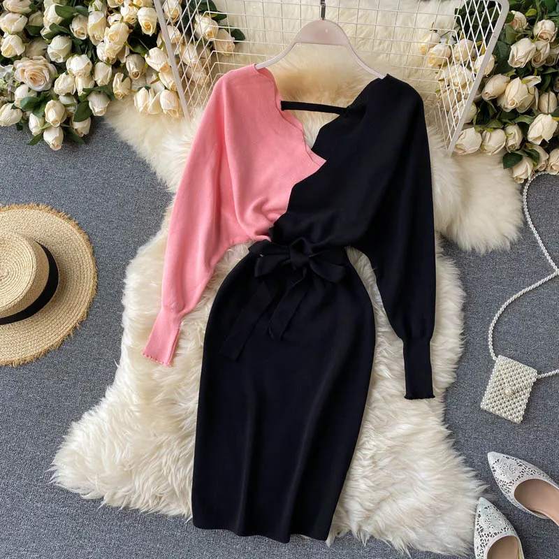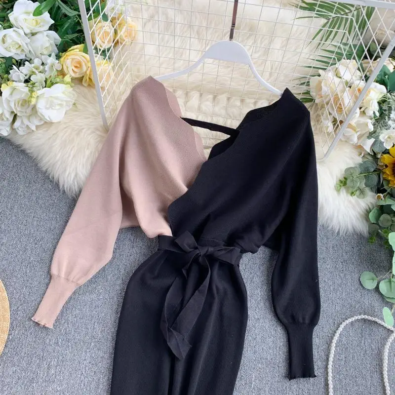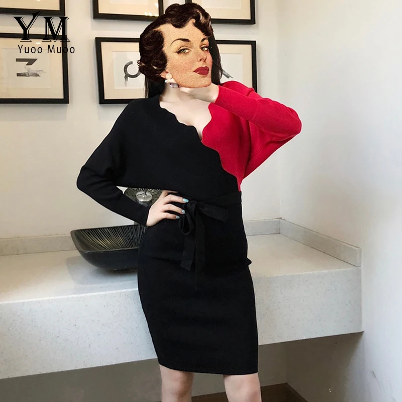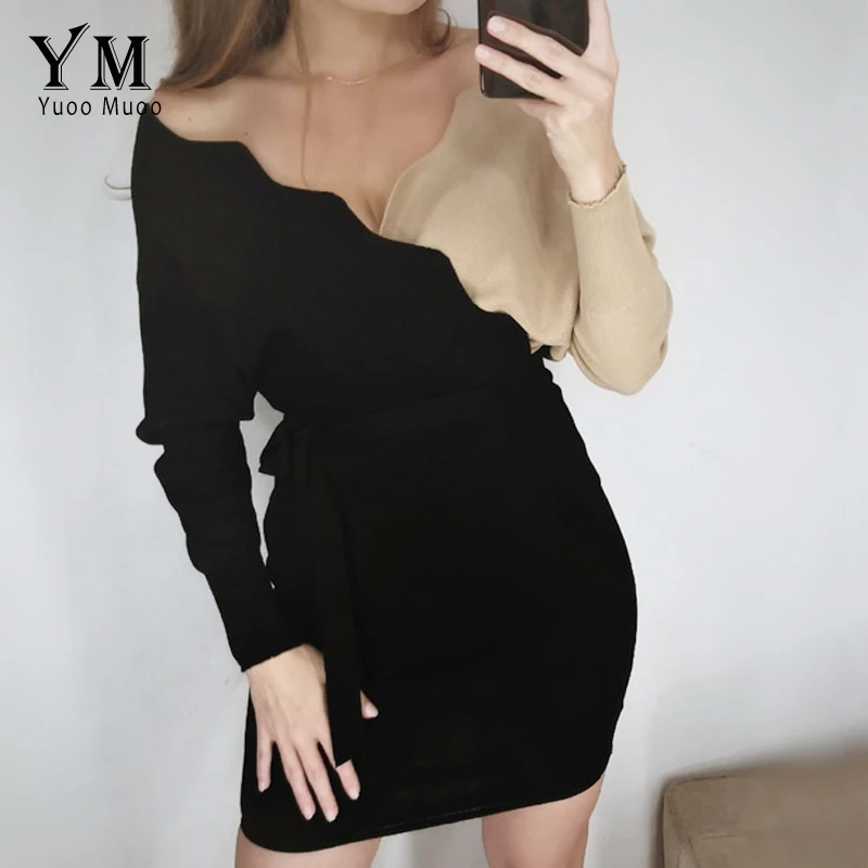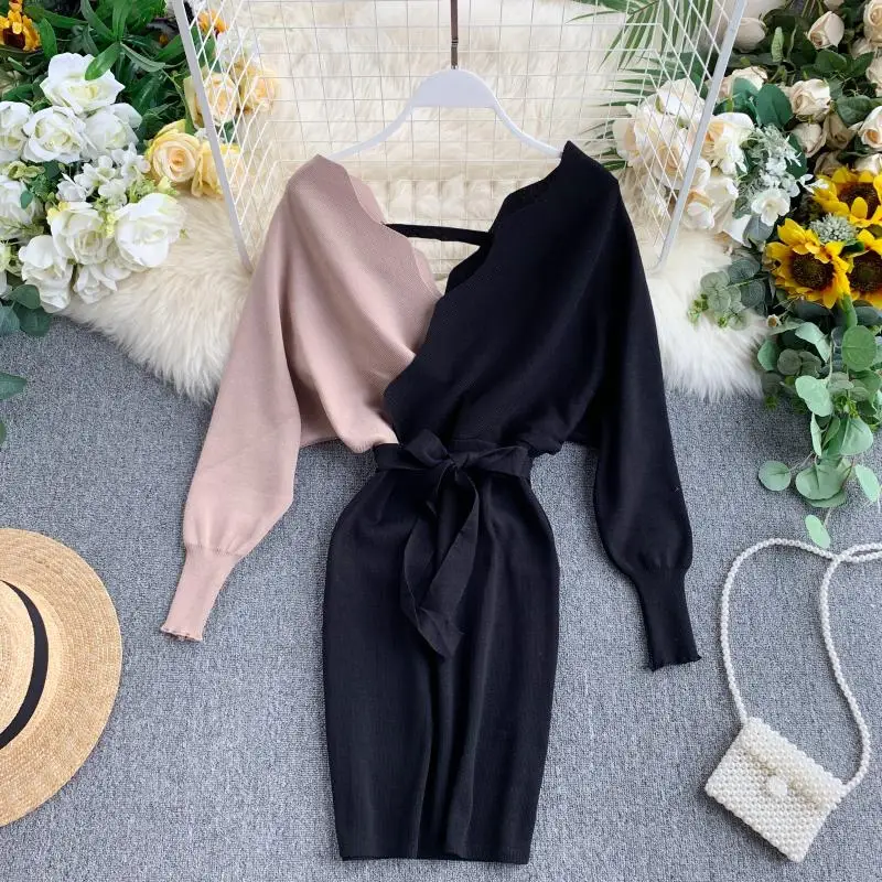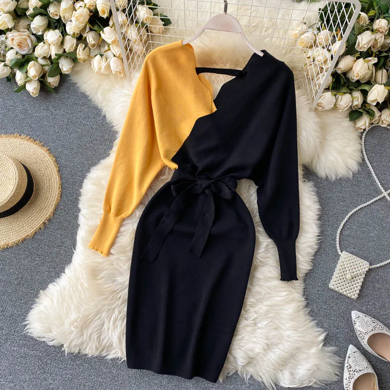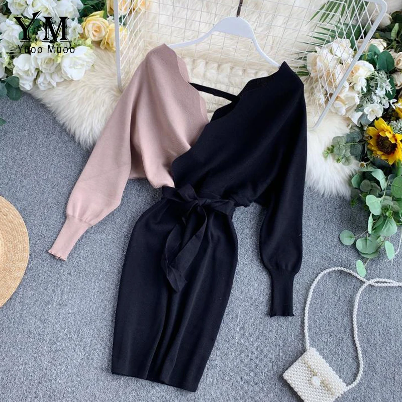 Женское трикотажное платье YuooMuoo, элегантное платье с поясом, V-образным вырезом, с открытой спиной, свитер с длинным рукавом, 2021, короткое платье, осень Женское обтягивающее платье
