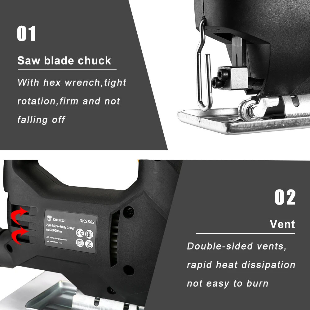 Лобзик DEKO DKSS02 350 Вт, удобная электрическая пила непрерывного режима с 1 лезвием, шестигранный ключ, 2 карбоновые щетки, электроинструменты