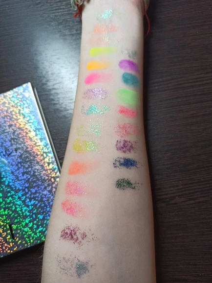 Девачкиии, я не могу. Увидела я эту палетку в тик токе у какой-то девушки и сразу же влюбилась. Заказала на случай какой-нибудь вечеринки или типа того. Это лучшая палетка за свои денюжки. Пигментация у нее шикарная, но все же нужно наносить под тени консилер или базу, светится в темноте/уф, не пылит, блестяшки это просто нечто;)) Я не визажист, а вполне обычный пользователь, но очень люблю баловаться с косметикой, а эта палеточка меня очень сильно порадовала