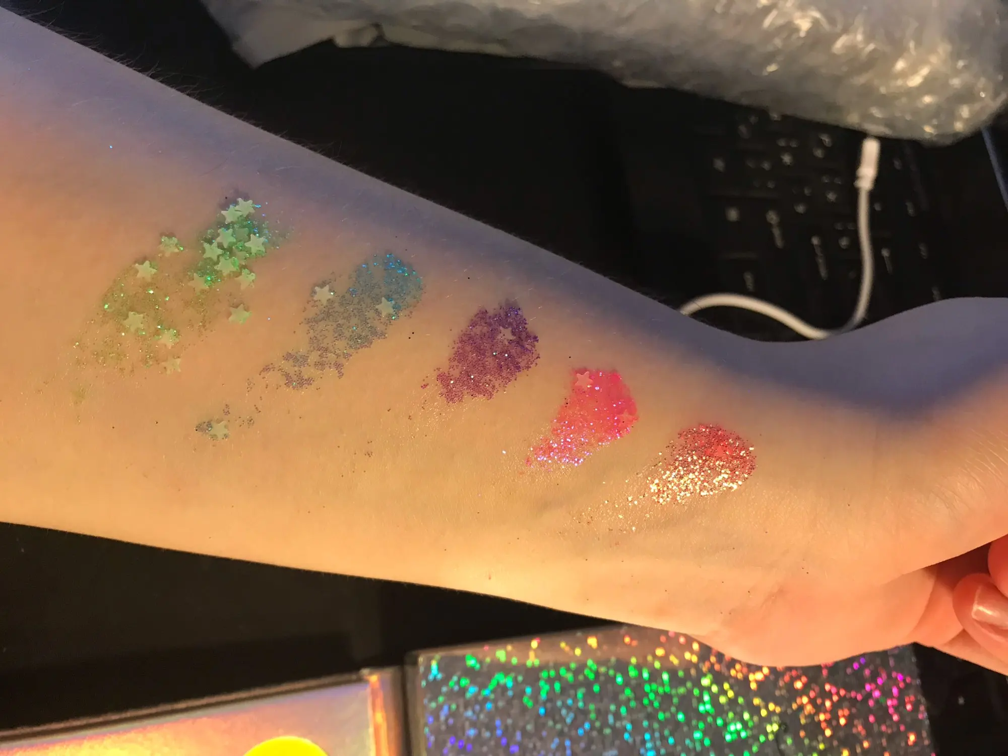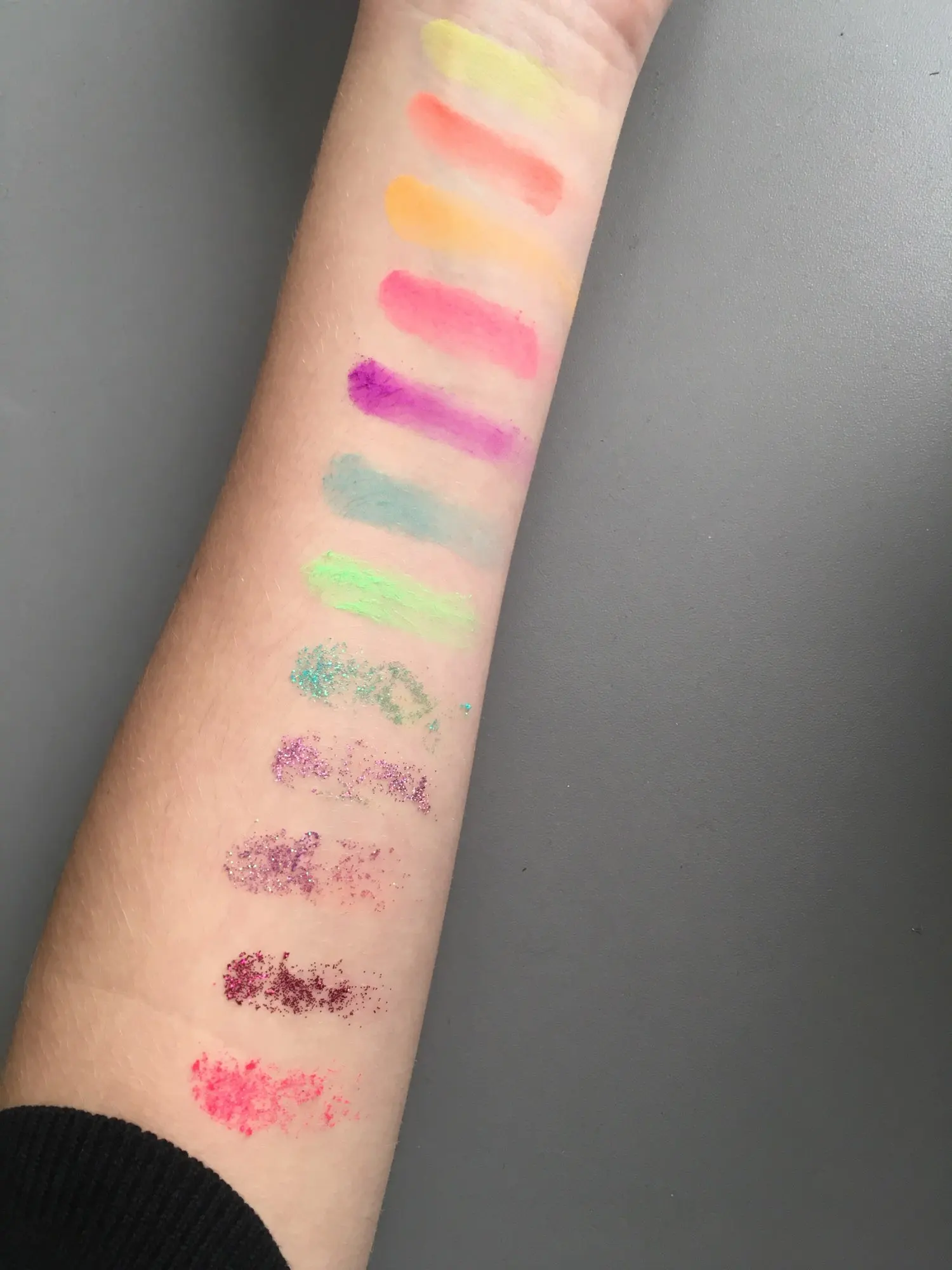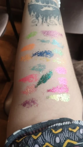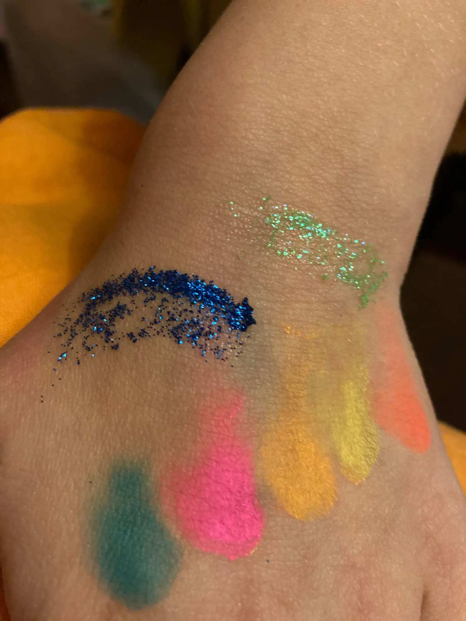 Отличный продукт, высокое качество по цене, которую у вас есть. Цвета хорошо пигментированы и блестят, а звезды хорошо прикрепляются к коже. Я думал, что это не так, но некоторые из этих цветов блестят УФ-светом. Они хорошо рассеиваются и немного держатся. Он пришел ко мне через две недели, быстрее, чем я ожидал. Упаковка красивая. Единственный хит, который я вижу, это запах, хорошо, он пахнет довольно искусственно, не как другие продукты для макияжа, которые более парфюмированы. Но я определенно рекомендую его. Идеально подходит для экспериментов с макияжем и цветами, а также с диско-подсветкой, она точно выглядит отлично (я еще не пробовал). Я не жалею о своей покупке. Я бы купил его снова. Отличное соотношение цена-качество.