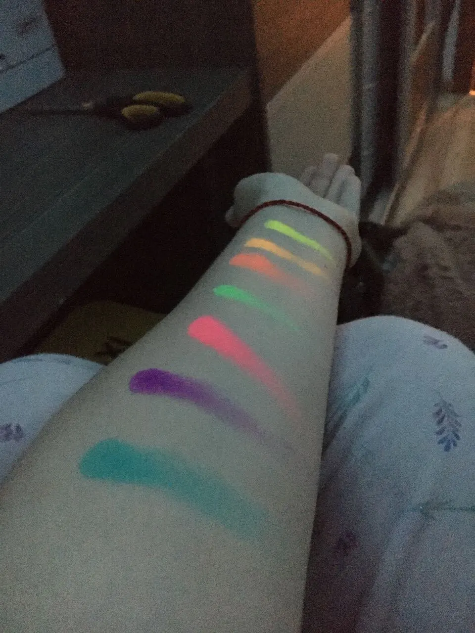 (на фото цвета БОЛЕЕ НАСЫЩЕННЫЕ, чем в жизни!!) очень крутые, прям кайфище! пигментированные, особенно хорошо ложатся блестки. Они не сухие, а будто как массой такой, на кинетический песок похоже. Совсем не остаются на кистях и пальцах, переносятся на веко. В темноте светятся только те, что со звездочками. При ултрафиолете или неоновом свечении в комнате ярко выделяются матовые неоновые цвета. Из минусов, немного пахнут клеем или странным пластиком, мб вызовут аллергию, но не знаю. Один цвет побитый пришел, но это можно восстановить наверное.