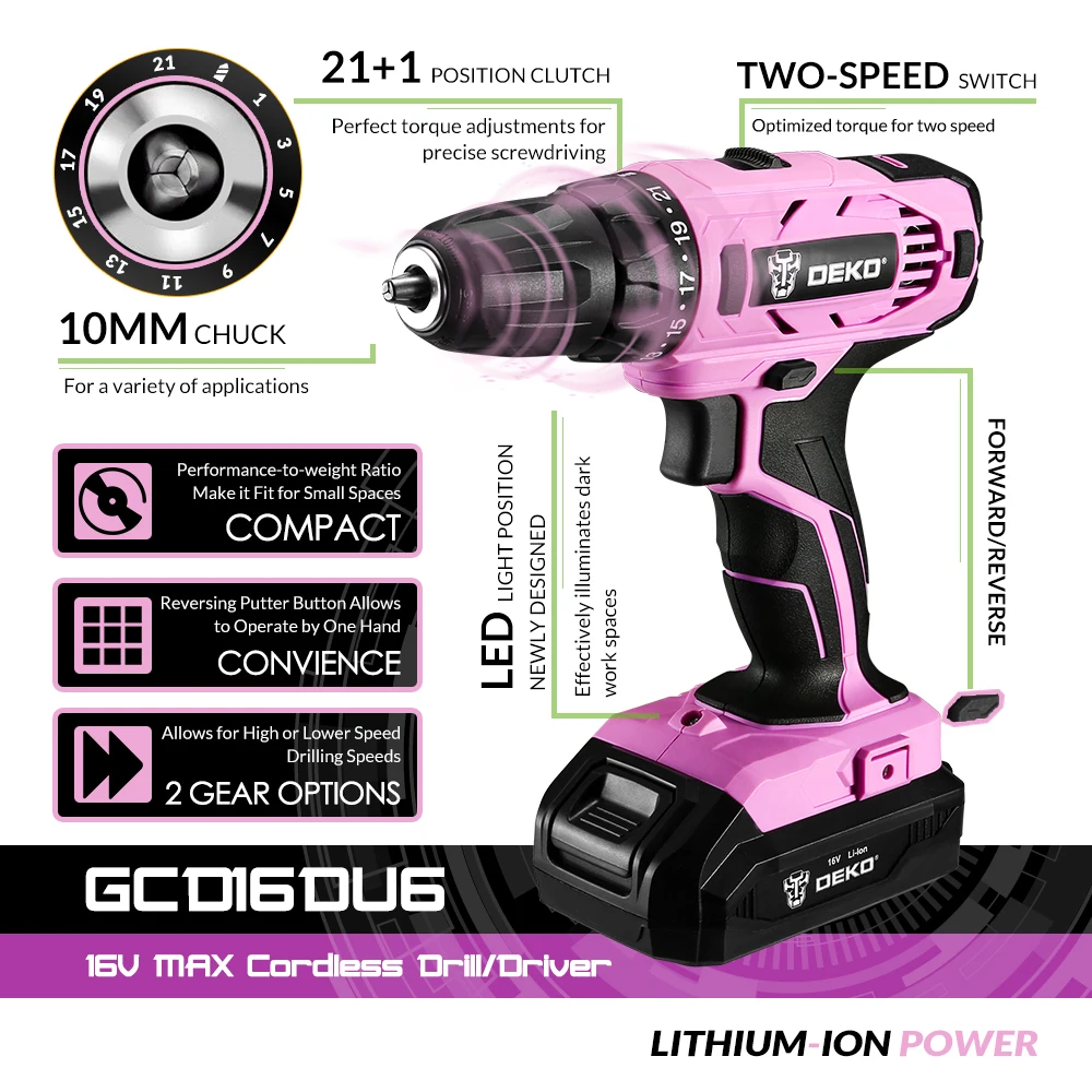 DEKO GCD16DU6 16V max Аккумуляторная дрель с максимальным крутящим моментом 30 Н. m сочетает в себе Двойной диапазон скоростей и 21 + 1 позиционное сцепление в компактном размере, что обеспечивает точный контроль сверления дерева, металла, пластика и всех задач по отвертке. Улучшены аккумулятор и светодиодные фонари этой электродрели. С большим перфоратором в маленькой упаковке,DEKOАккумуляторная дрель GCD16DU6-отличная основа для любого профессионального подрядчика или коллекции электроинструментов DIYer.
