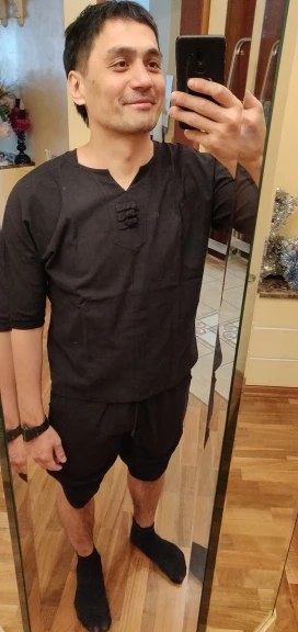 Качество отличное, льняной, на размер 50 взяли 3xl, впритык, но если брать на размер больше, будут велики штаны, но это уже особенности фигуры. Мне очень нравится как сидит на супруге, думаю себе такой же взять поменьше. Хорошая вещь за небольшие деньги