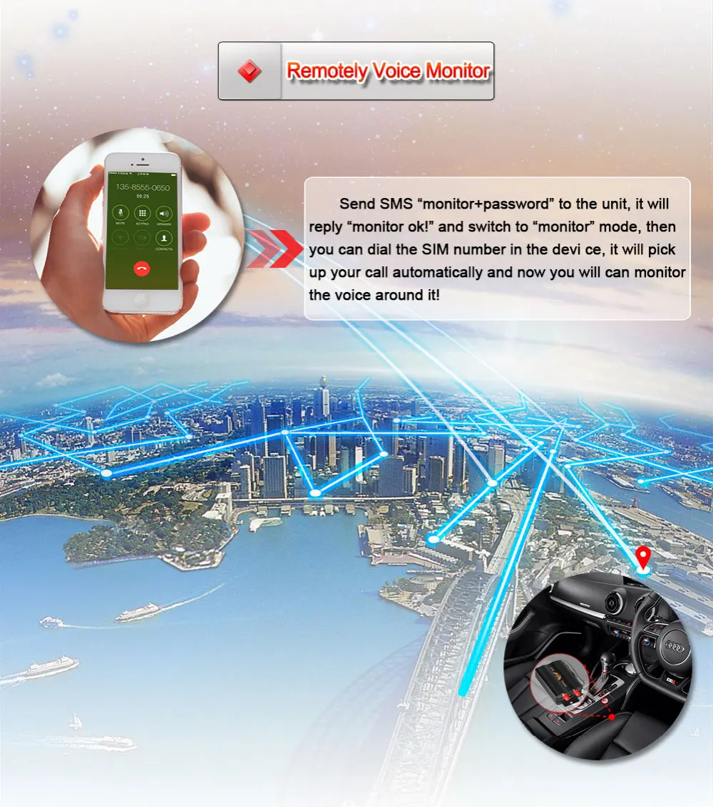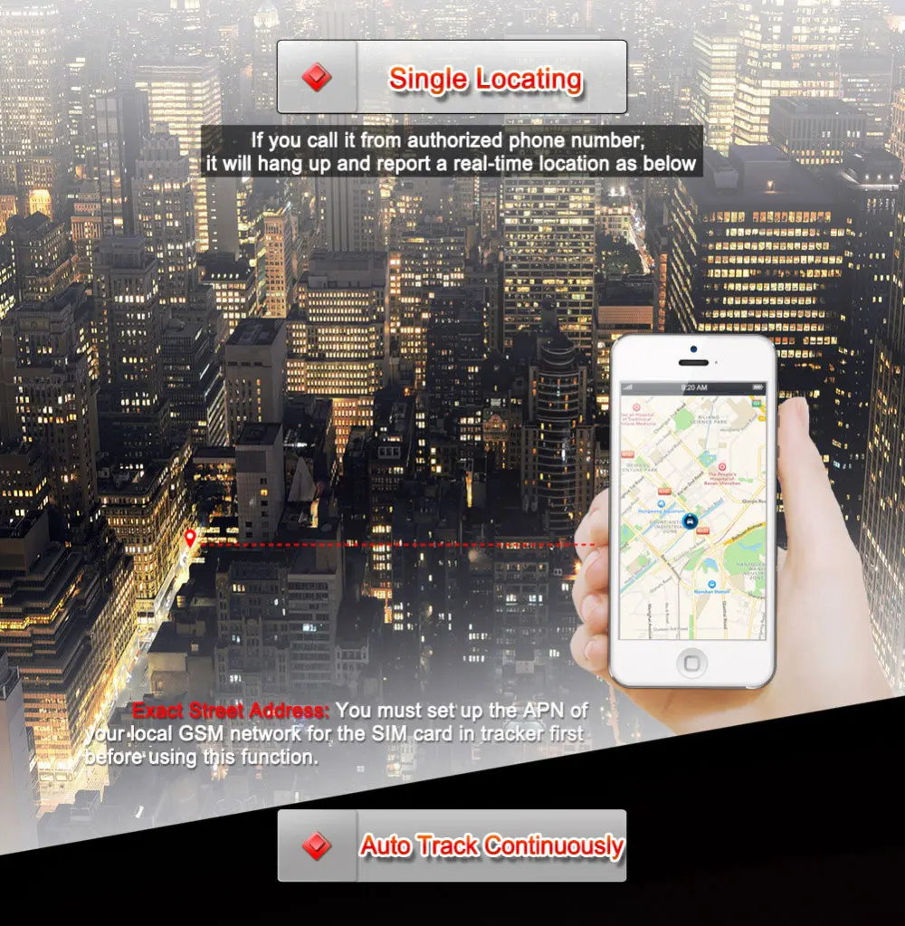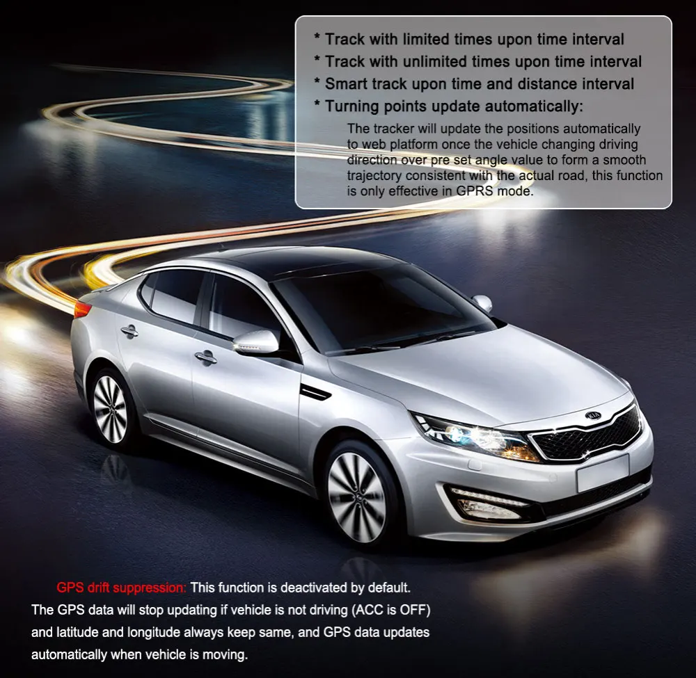 1. Переключатель режимов «Track» и «Monitor»: режим по умолчанию-«track» (Track mode), если вы хотите контролировать голос вокруг устройства, пожалуйста, отправьте «монитор + пароль» на трекер, чтобы переключить его на режим монитора, затем вы позвоните на номер sim-карты в трекере, вы сможете следить за голосом вокруг него; Вы можете отправить «трекер + пароль», чтобы переключить устройство обратно в режим отслеживания. 2. Одно Расположение: * Если есть какие-либо авторизованные номера, трекер ответит на все звонки с отчетом о местоположении. Если авторизованные номера были настроены, то только авторизованные номера смогут получить отчет о местоположении от трекера; * Набор устройства отслеживания с авторизованных номеров, он повесит вызов и ответит на сообщение со ссылкой на карту google и широтой и долготой в реальном времени; * При потере фиксируется на спутники (без gps-сигналов), он будет отслеживаться LBS / CELL-ID. Затем ответ SMS будет включать две позиции:-GPS координаты последней известной позиции.-Код LAC. Откройте www.gpstrackerxy.com найдите «ручную дорожку» и поместите полученный код в поля LAC и Cell-ID на место по технологии LBS. 3. Автоматический трек непрерывно: * Отслеживайте с ограниченным временем по временному интервалу, например, отправьте sms-команду «fix030s005n + пароль» на устройство отслеживания, он сообщит информацию о положении с интервалом 30s 5 раз.* Отслеживайте с неограниченным временем по временному интервалу, например, отправьте SMS «fix030s030m *** n + пароль» на трекер. Трекер будет сообщать о местоположении в реальном времени каждые 30 секунд, когда АКК включен, и сообщать о местоположении каждые 30 минут, когда АКК выключен. Примечание: интервал должен быть не менее 10 с.* Умный трек с интервалом времени и расстояния, эта функция означает, что устройство может быть отслежено заданным расстоянием и временным интервалом двух факторов. 4. Автоматическое обновление поворотных точек: трекер автоматически обновит информацию о положении на веб-сервер, как только транспортное средство изменит направление движения над предварительно установленным значением угла для формирования гладкой траектории, соответствующей фактической дороге, эта функция работает только в режиме GPRS. 5. Подавление дрифта GPS: Эта функция деактивирована по умолчанию, отправьте «подавить + пароль» на трекер, он ответит «подавить Дрифт ок». Данные GPS перестают обновляться, если транспортное средство не движется (ACC выключен), а широта и долгота всегда остаются прежними, и данные GPS обновляются автоматически при движении транспортного средства (ACC включен). 6. Точный уличный Адрес: Перед использованием этой функции необходимо настроить APN вашей локальной сети GSM для sim-карты в трекере; После настройки APN, отправьте «адрес + пароль» на устройство, он ответит на SMS, включая точный уличный адрес. Например: No.8, Guankou 2nd Rd, Nantou, Nanshan district, Shenzhen, Guangdong, china. 7. Сервис на основе местоположения (LBS) /определение местоположения сотового идентификатора: если трекер не может установить твердое исправление GPS, он рассчитает свое местоположение с помощью определения местоположения сотового идентификатора GSM. Отчеты о местоположении будут включать gps-координаты последних известных позиций, а также код LAC, введя код LAC в меню «Ручная дорожка» веб-платформы отслеживания www.gps trackerxy.com позволит вам увидеть текущее местоположен