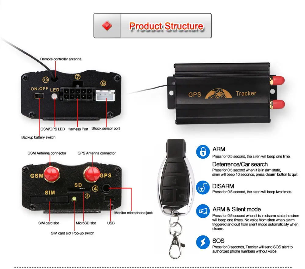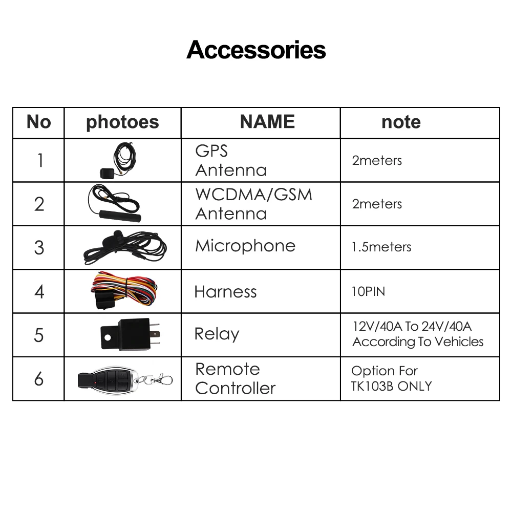 1 * GPS трекер GPS 103B1 * GPS антенна 3 метра1 * GSM антенна 3 метра1 * пульт дистанционного управления1*10 штырь проводки1 * реле1*1,5 м Микрофон1 * Руководство пользователя1 * оригинальная коробка (опционально)(В комплект не входят sim-карты и sd-карты)