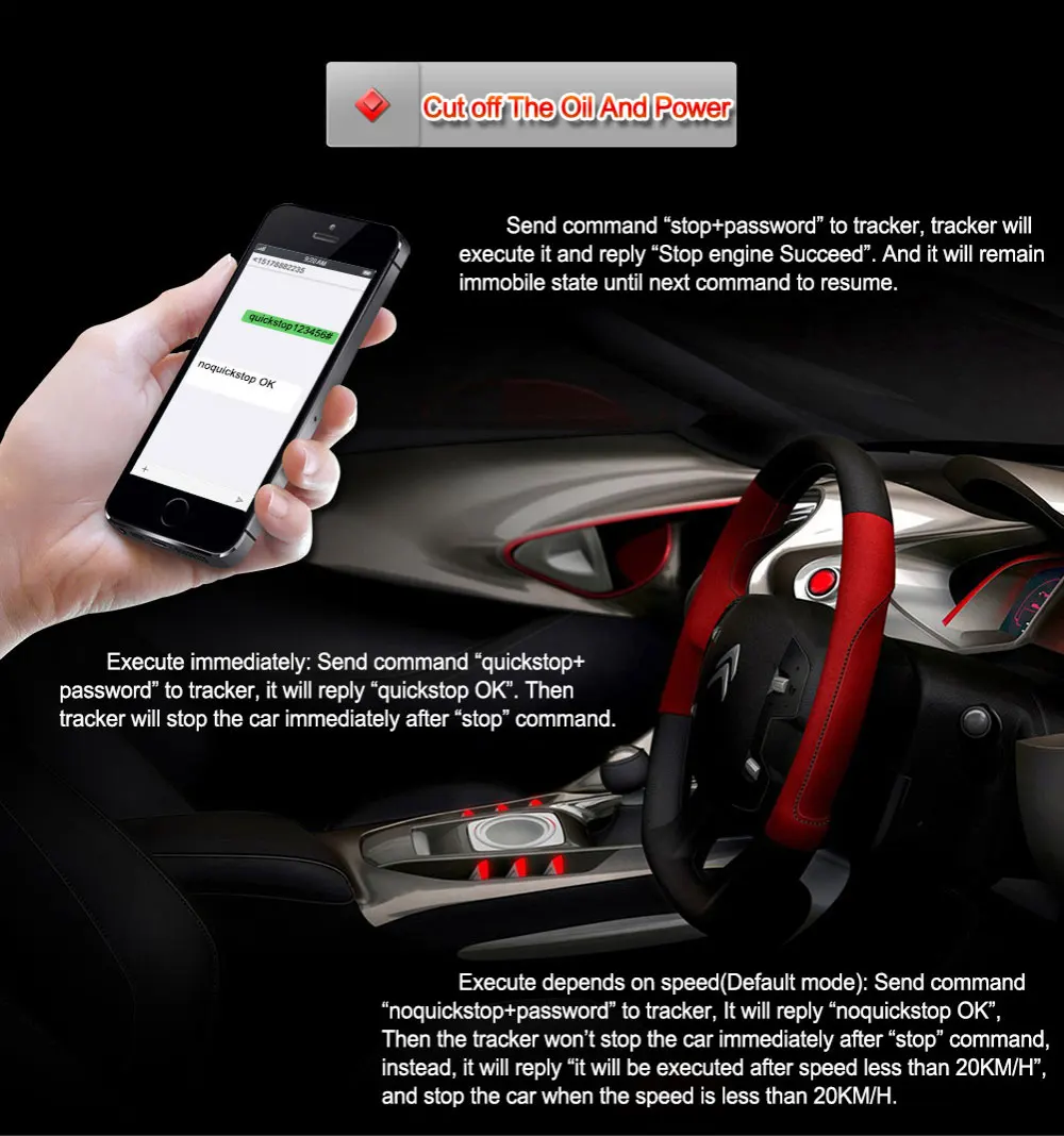 11. Рабочая сигнализация ACC: трекер отправит "ACC on + latitude & longitude" на авторизованные номера при обнаружении зажигания, что означает, что транспортное средство было начато; И трекер отправит «ACC off + latitude & longitude» на авторизованные номера при выключении зажигания и ACC, это означает, что транспортные средства были остановлены. 12. Отрежьте масло и энергосистему: * Выполните режим немедленно: отправьте команду «quickstop + password» для отслеживания, она ответит «quickstop OK». Затем трекер остановит автомобиль сразу после команды «стоп».* Выполнение зависит от режима скорости (режим по умолчанию): Отправить команду «noquickstop + пароль» на трекер, он ответит «noquickstop OK», затем трекер не остановит автомобиль сразу после команды «стоп», вместо этого он ответит «он будет выполнен после скорости менее 20 км/ч», И Остановите автомобиль при скорости менее 20 км/ч. 13. Рычаг/замок: отправка sms-команды «Arm + пароль» на трекер, терминал транспортных средств изменится на состояние руки, между тем, дверь автомобиля заблокирована, И он ответит SMS «трекер активирован». Если автомобиль находится в состоянии зажигания (ACC включен), дверь автомобиля будет заблокирована, но рука потерпит неудачу, тем временем, он ответит SMS «настроить не удалось! Пожалуйста, выключите ACC». Если двигатель выключен, но дверь открыта, то автомобиль не может войти в состояние руки и ответить «установка не работает, пожалуйста, закройте дверь». 14. Демонтаж/разблокировка: отправка sms-команды «Disarm + password» на устройство отслеживания в транспортном средстве, он ответит «трекер отключен» как в вооруженном, так и в обезвреженном состоянии, И sms-команда заставит устройство слежения войти в безоружное состояние, если устройство в настоящее время вооружено. Если дверь открыта, датчик вибрируется, двигатель запускается при отключении функции руки. 15. Silent arm: Отправьте SMS «silent + password» на трекер, он ответит «silent ok!». Это означает, что трекер входит в Тихий режим, и дверь также будет заблокирована; Сирена не будет звучать после срабатывания будильника, но трекер отправит SMS на авторизованные номера. 16. Решить, сколько раз сигнал тревоги: вы можете решить, сколько раз сигнал тревоги будет отправлен, для тех сообщений тревоги, отправленных в цикле, вы можете ограничивать время отправки сообщения тревоги. Например, отправьте SMS «xtime + password + 005» на трекер, сигнал тревоги будет отправлен 5 раз после срабатывания будильника. 17. Несколько сигналов тревоги: * Аварийная сигнализация SOS: Нажмите кнопку SOS на кабелях в течение 3 секунд, устройство отправит sms: «Помогите мне + lat/long» на каждый авторизованный номер с интервалом в 3 минуты. Без звуков от сирены. Оповещения будут остановлены после получения «Помогите мне» с любого авторизованного номера телефона. * Сигнал низкого заряда батареи: трекер отправит SMS «Низкая батарея + Широта/долгота» в авторизованные номера 2 раза в общей сложности с интервалом 15 минут, когда напряжение батареи будет около 3,55 в. * Сигнал отключения питания: он отправит SMS «Будильник + Широта/долгота» на авторизованные номера каждые 3 минуты, когда внешняя мощность отключена. * Оповещение о слепой точке GPS: он отправит оповещение SMS «Нет gps + последняя действительная Широта/долгота перед потерей gps-сигнала». * Гео-забор: Установите гео-забор для устройства слежения, чтобы ограничивать его движения в пределах района. Устро