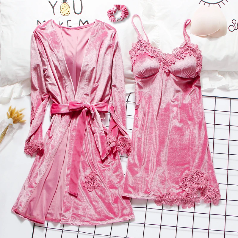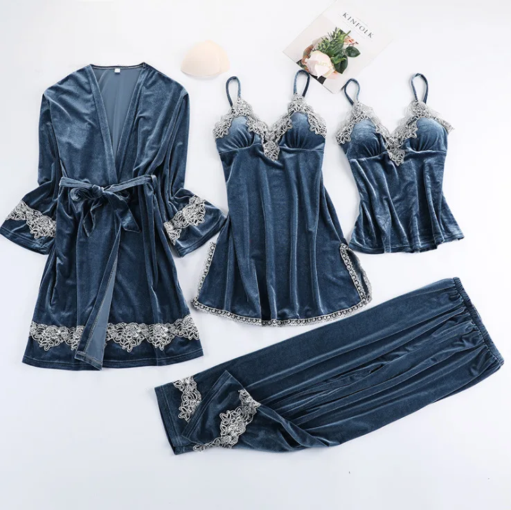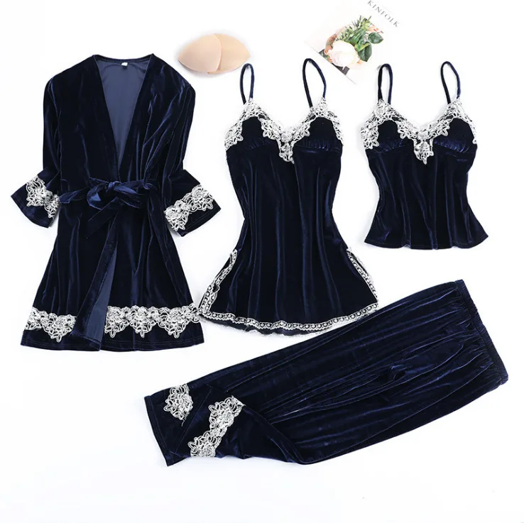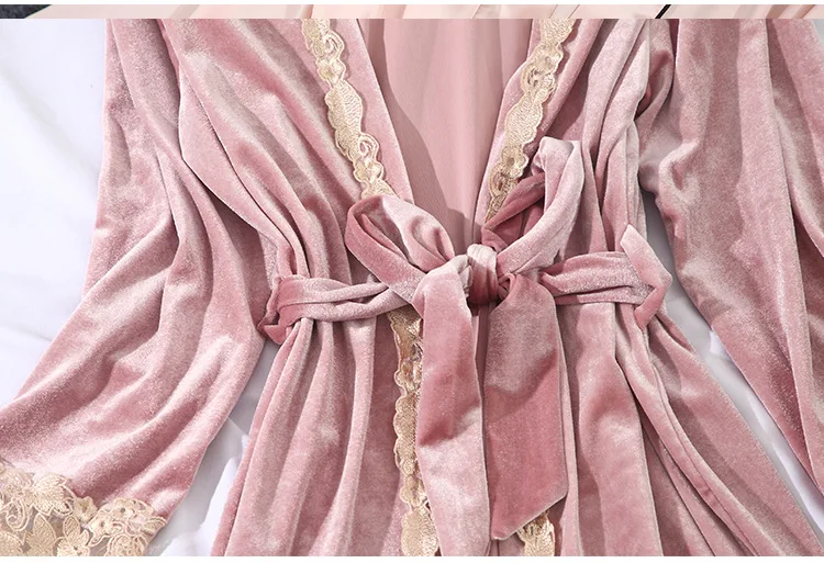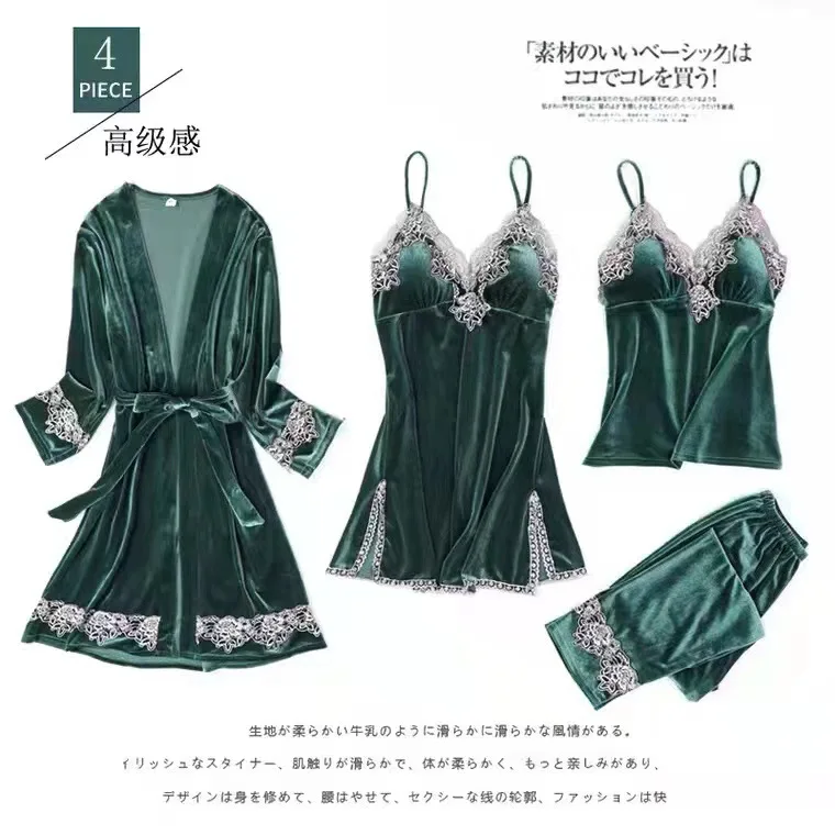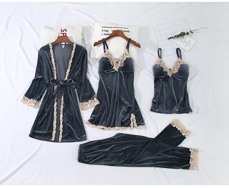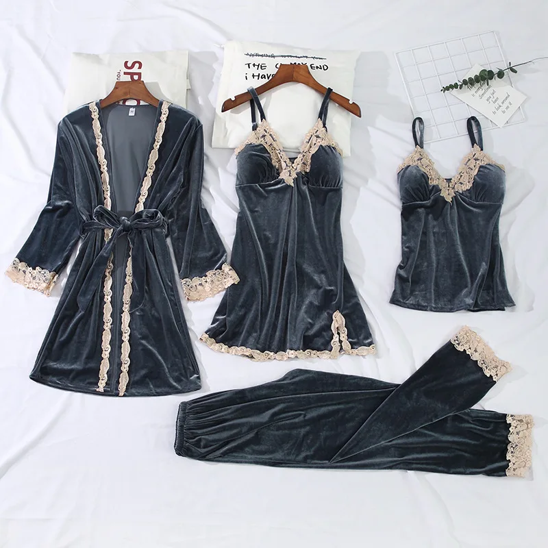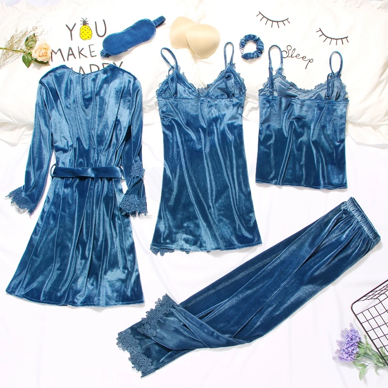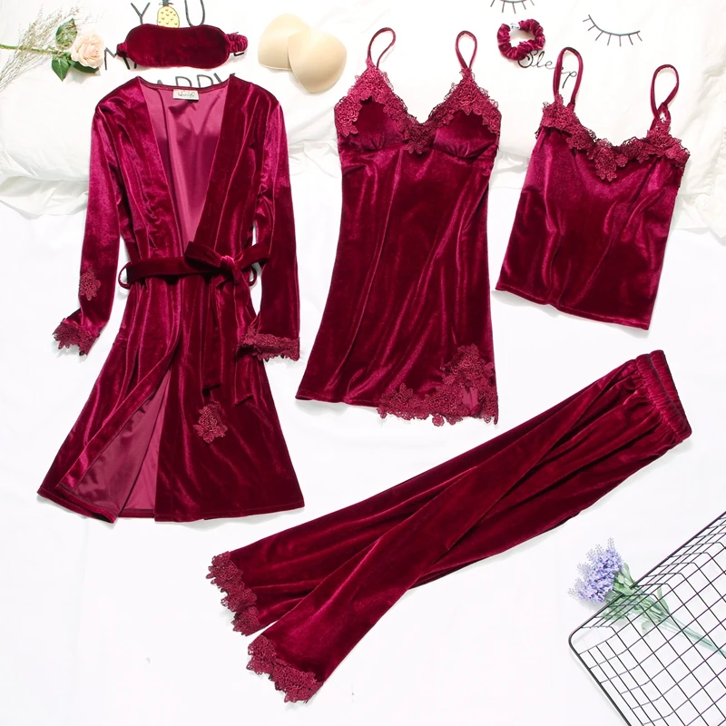Золотистый бархатный комплект из 3-6 предметов, теплые зимние пижамные комплекты, женский сексуальный кружевной халат, пижама, одежда для сна, ночная рубашка, домашняя одежда