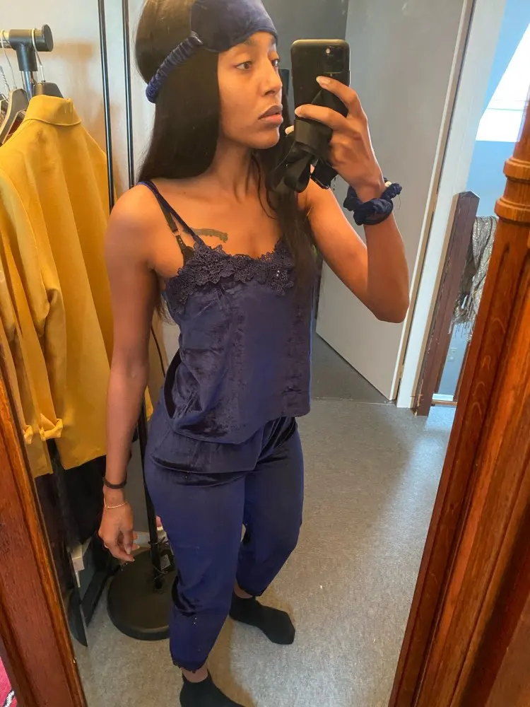 Многие отзывы сказали, что он маленький, поэтому я заказал L, но он действительно большой для тех, у кого Средний размер. Плюс, это был единственный доступный размер, поэтому я сохранил его. Халат хорошо сидит, брюки также окаймленные, но платье и топ слишком большие. Мне нужно его взять.