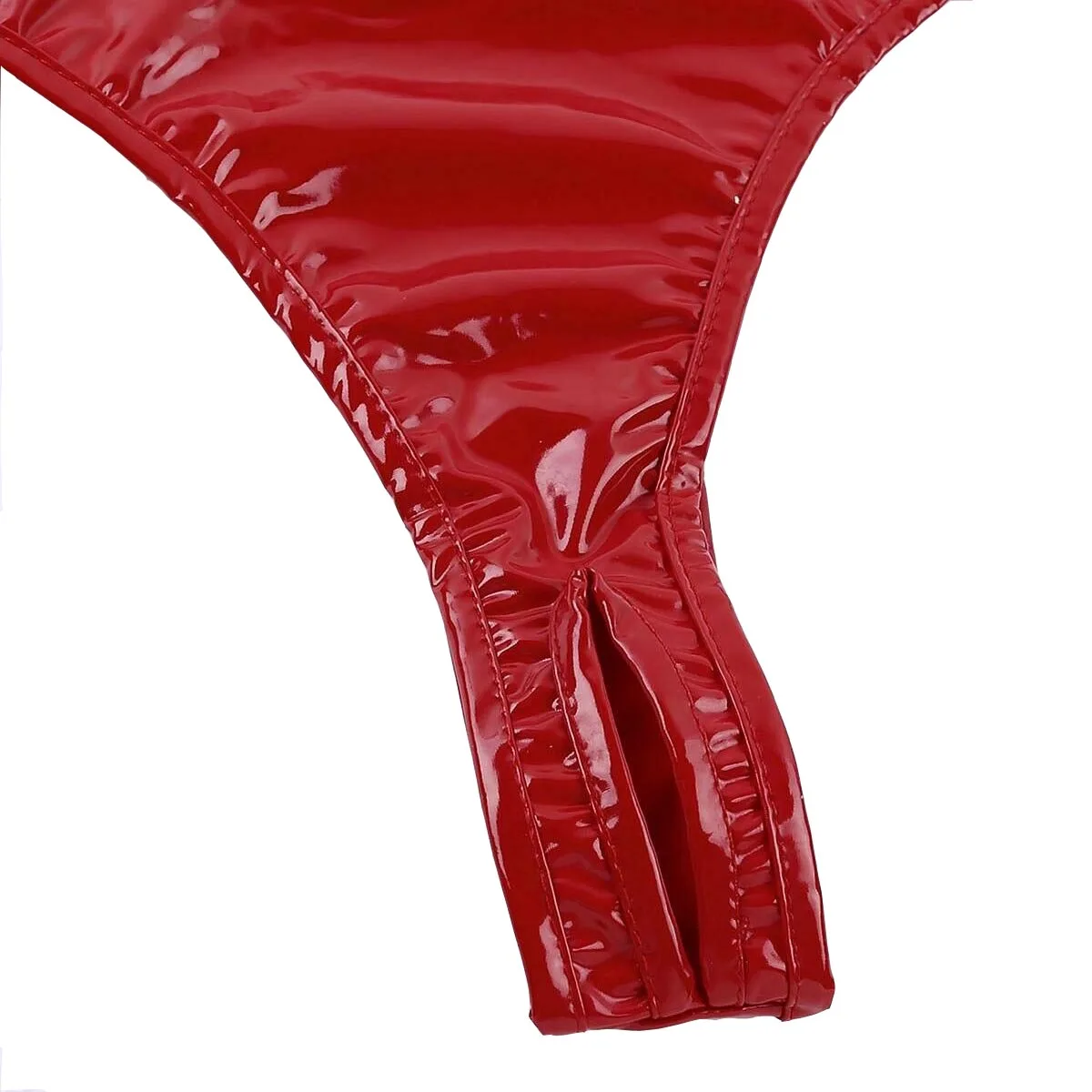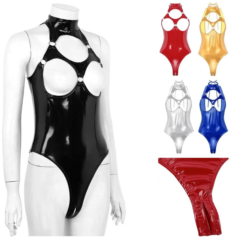 Сексуальное нижнее белье из стринги с открытой промежностью лакированной кожи, трико с металлическими кольцами, без чашек, с мокрым эффектом, боди, купальник, нижнее белье