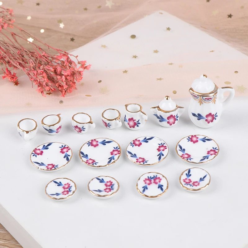 Набор миниатюрных фарфоровых чайных чашек 1:12, 15 предметов, ситец, Цветочная посуда, кухонная мебель для кукольного домика, игрушки для детей