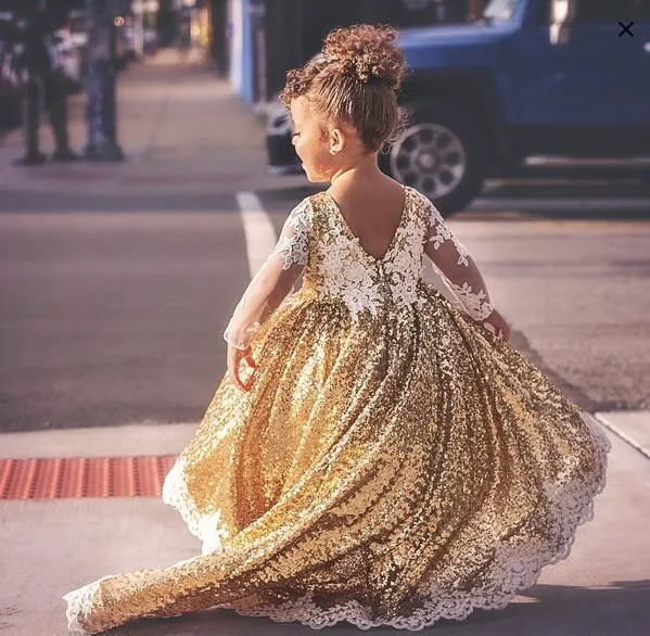 Золотистые блестящие платья с цветами для девочек, детское платье для выпускного вечера, Пышное Платье с длинными рукавами для малышей, праздничное платье на день рождения