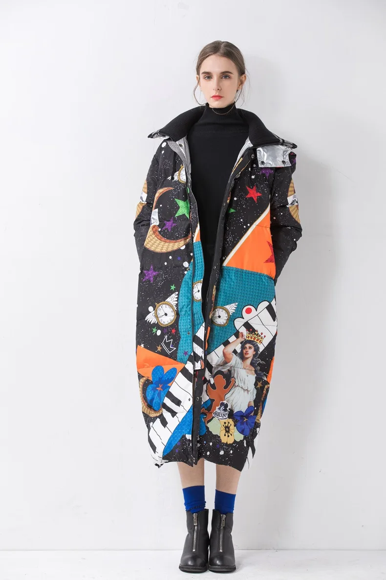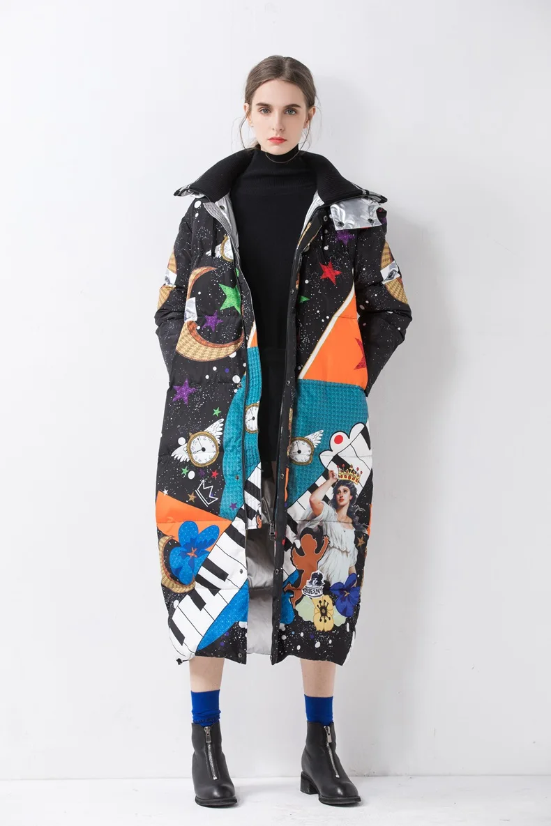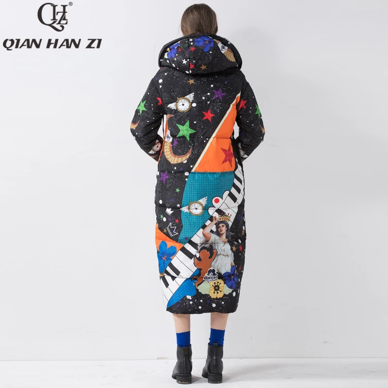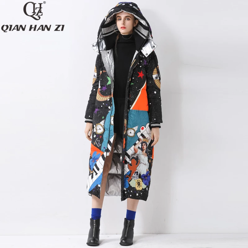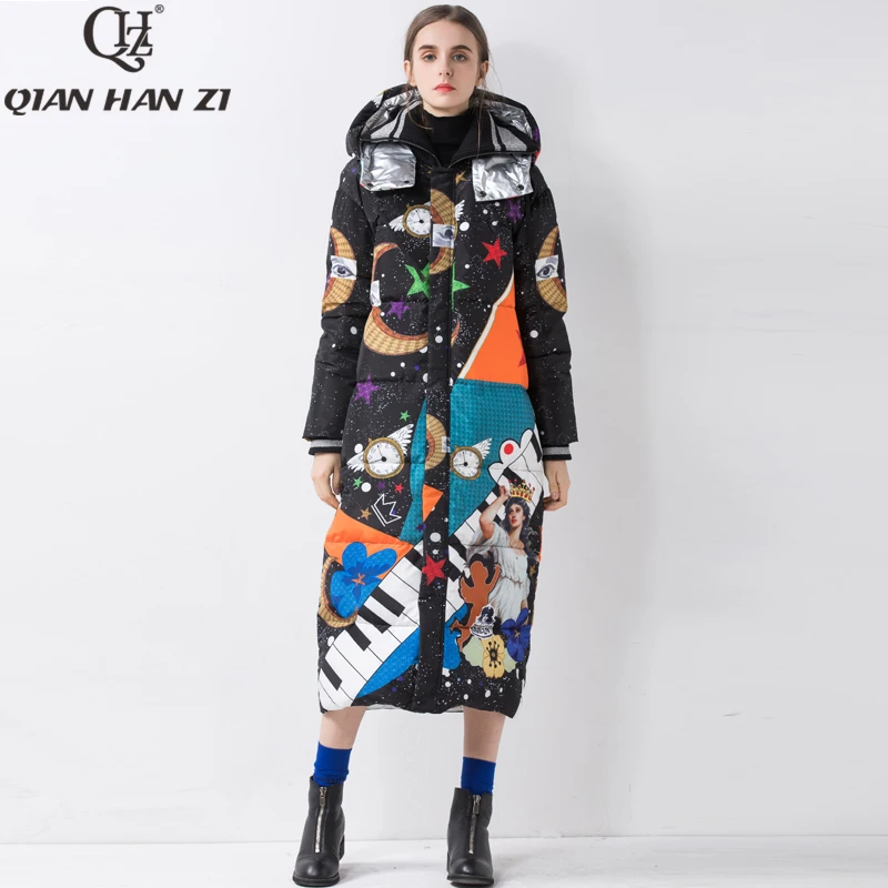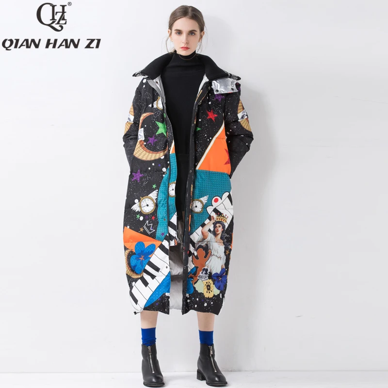 Женский пуховик с принтом Qian Han Zi, длинный теплый пуховик на белом утином пуху, зимнее пальто свободного кроя