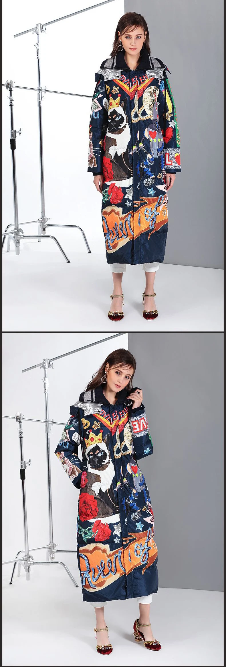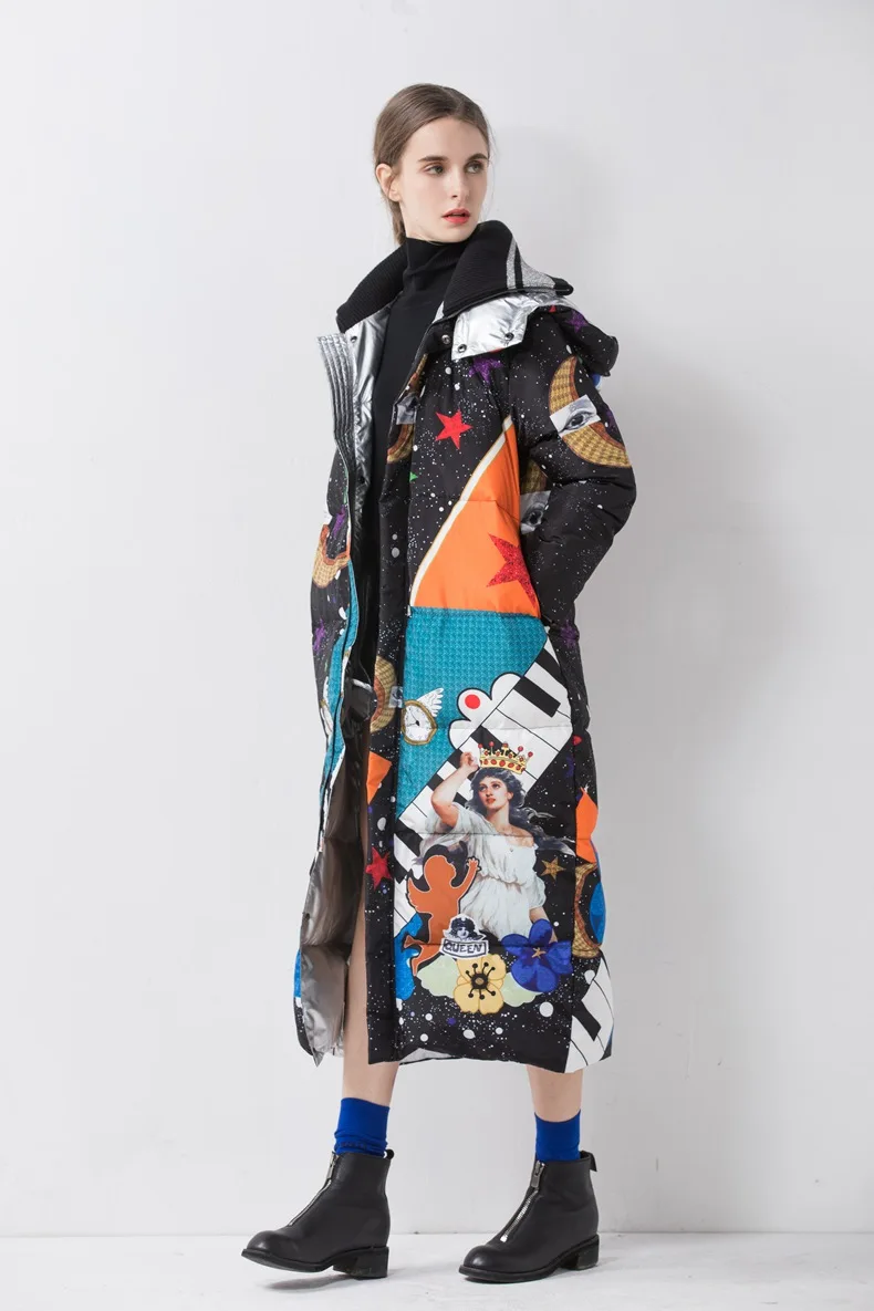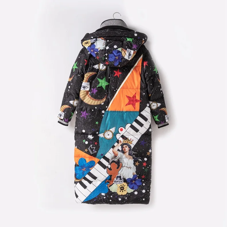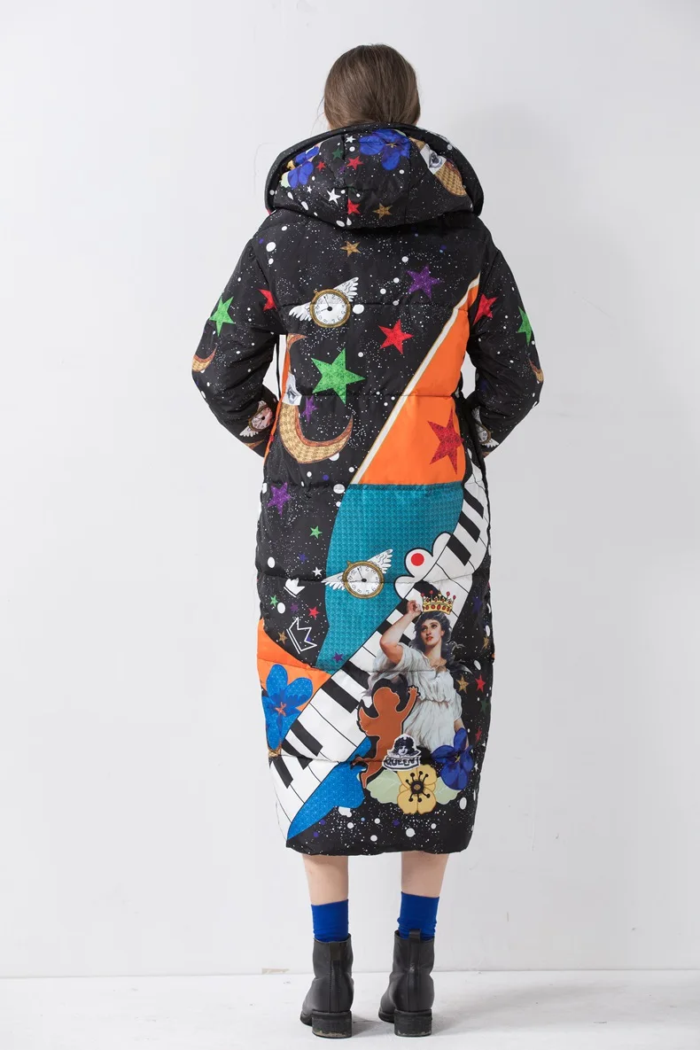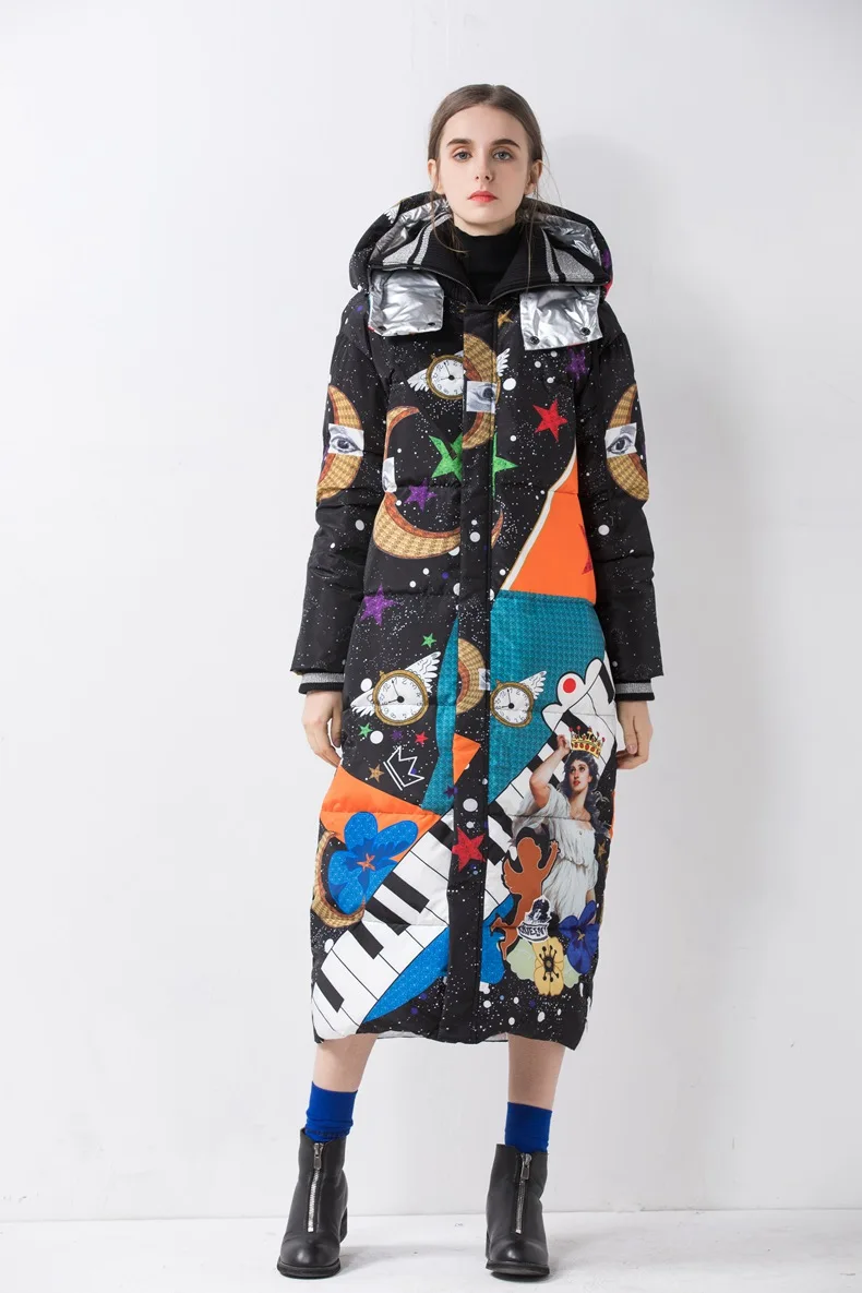 Женский пуховик с принтом Qian Han Zi, длинный теплый пуховик на белом утином пуху, зимнее пальто свободного кроя