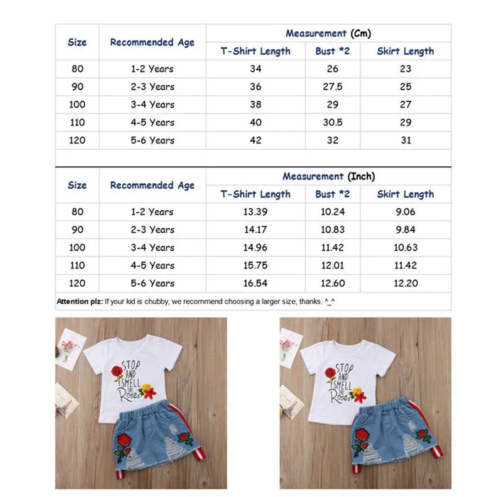 Pudcocoтопы с короткими рукавами и цветочным принтом для маленьких девочек + джинсовые юбки с вышивкой розы, комплект одежды из 2 предметов, одежда для От 1 до 6 лет