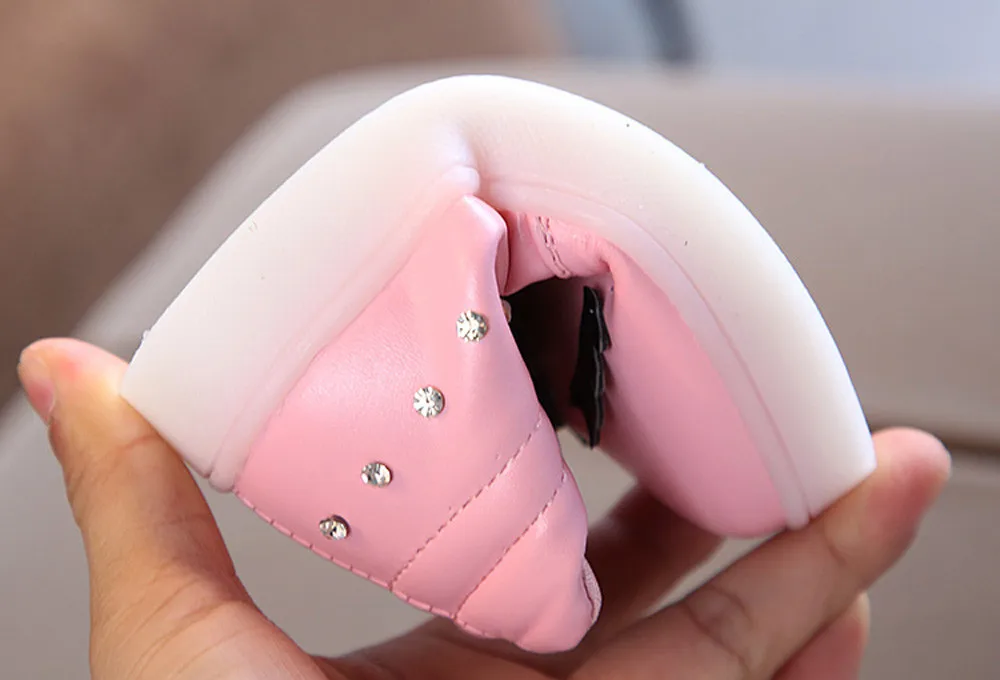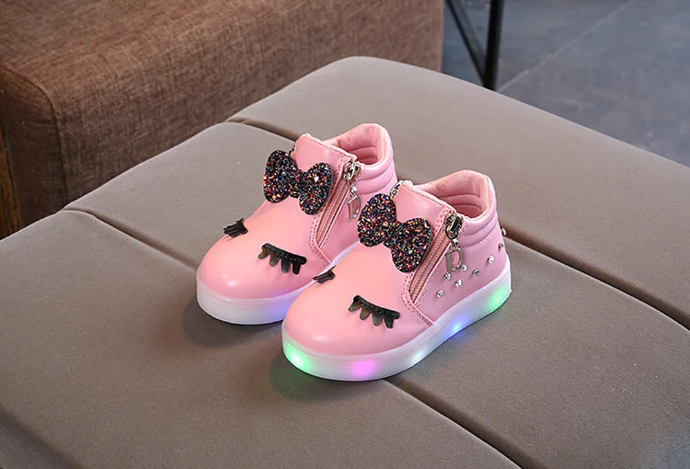 Ботинки для девочек со светодиодами, детские, для маленьких девочек, с хрустальным бантом, ботинок с подсветкой обувь, кроссовки с узлом-бабочкой, белые туфли со стразами