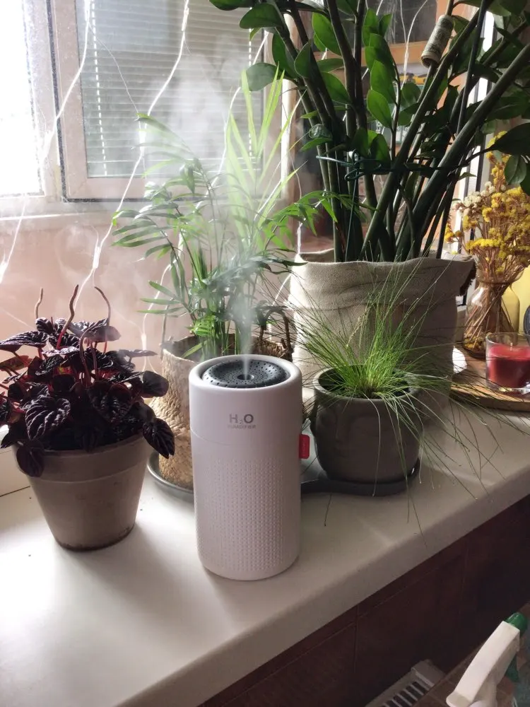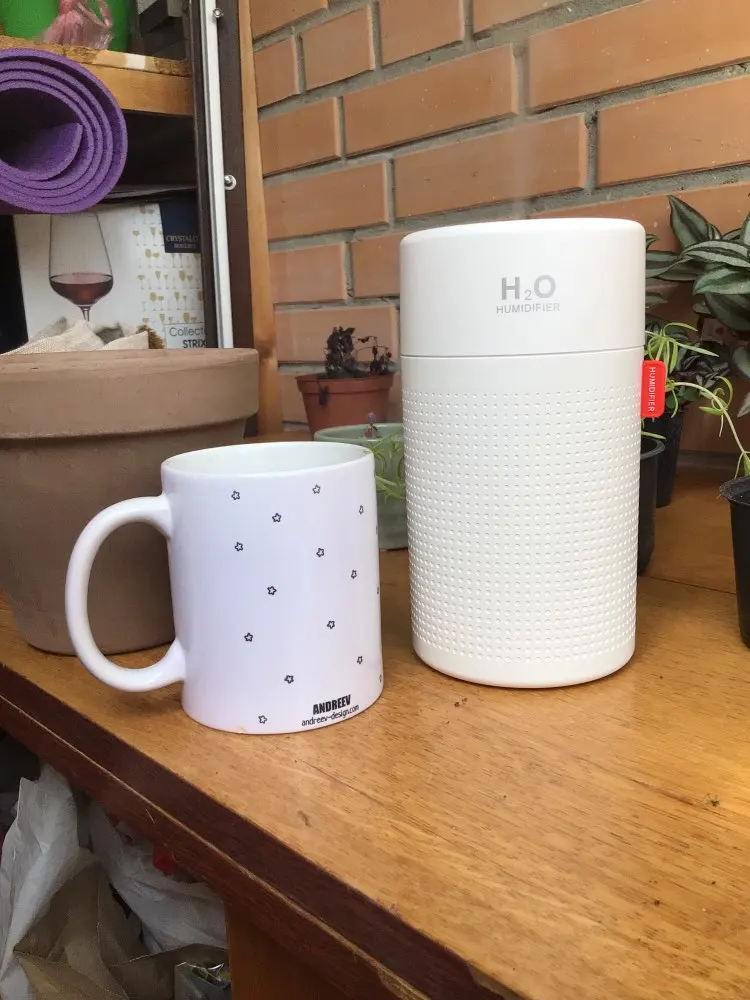 Очень понравился. Не большой и не маленький, работает без провода, звук еле слышный, упакован в фабричную коробку, и сверху в коробку почты. Дополнительные фильтры на месте. Приехал заряжений, налила воду, сразу начал работать. Работает мощнее чем я ожидала. Фонтан пара поднимается на 25-30 см , потом опускается и рассеивается. Луж не оставляет. В комплекте шнур для зарядки и инструкция на английском. Для сравнения размера фото рядом со стандартной чашкой. Цветам нравится)