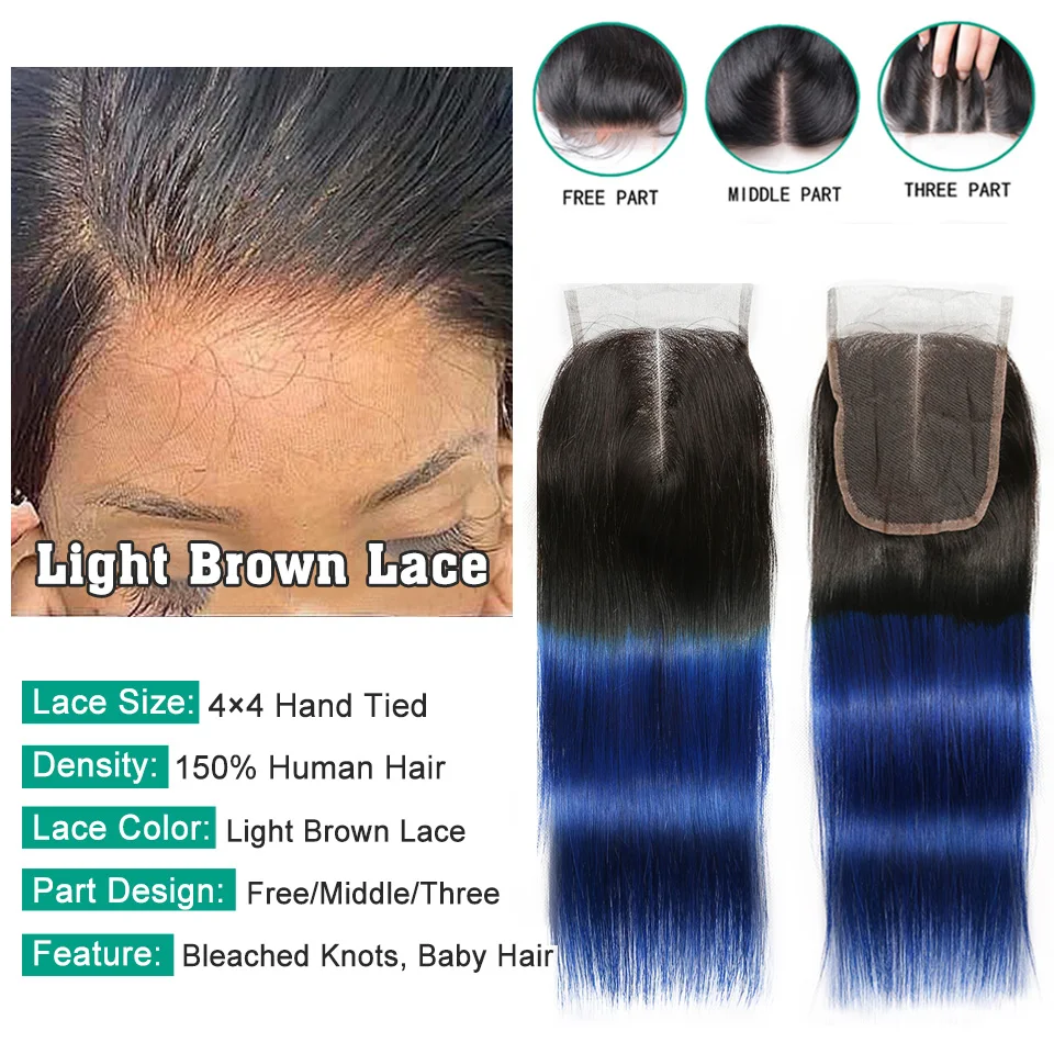 Синие пряди с закрытием Омбре прямые 3 пряди с кружевным фронтальным ухом к уху темно-черные корни Remy бразильские человеческие волосы пакет