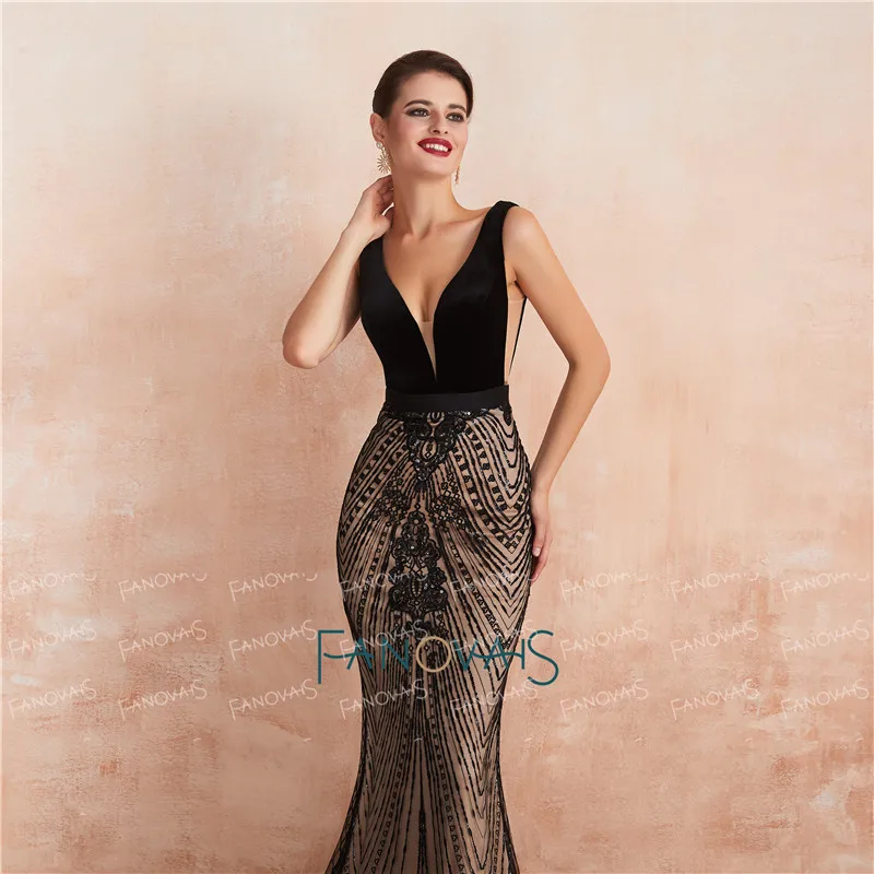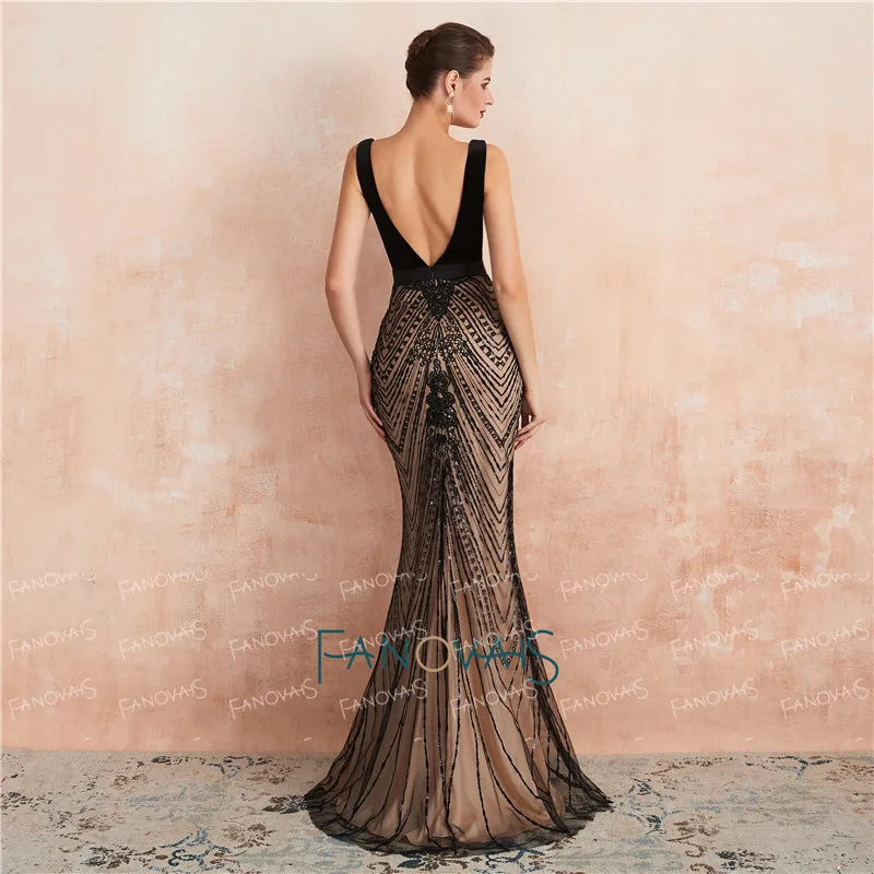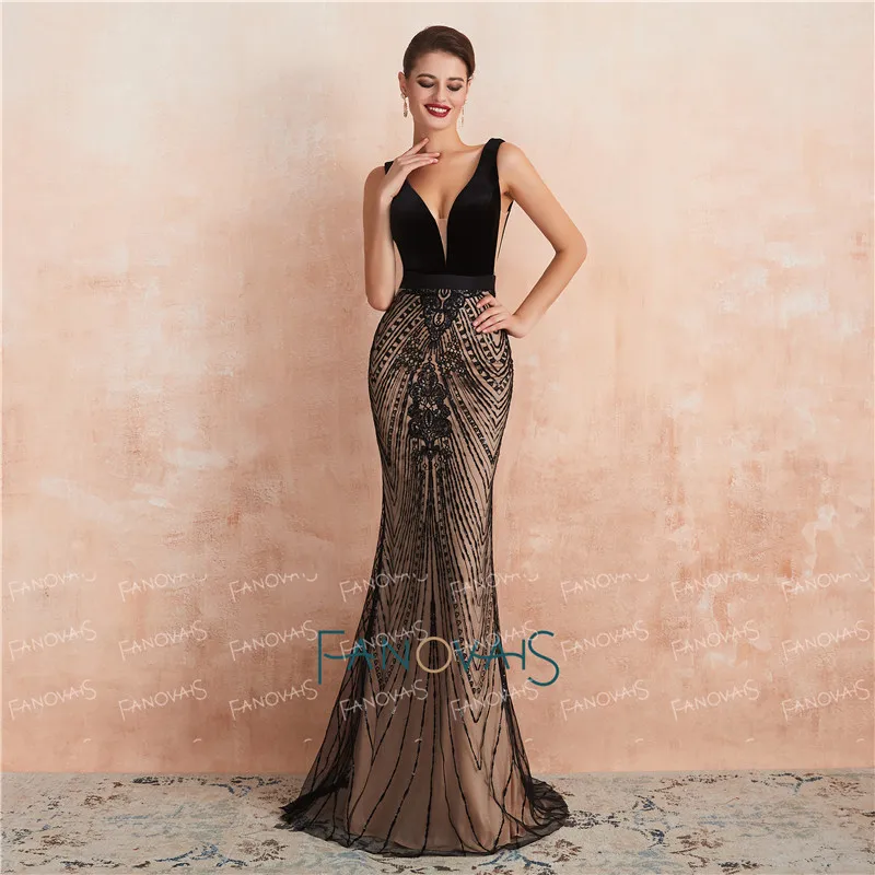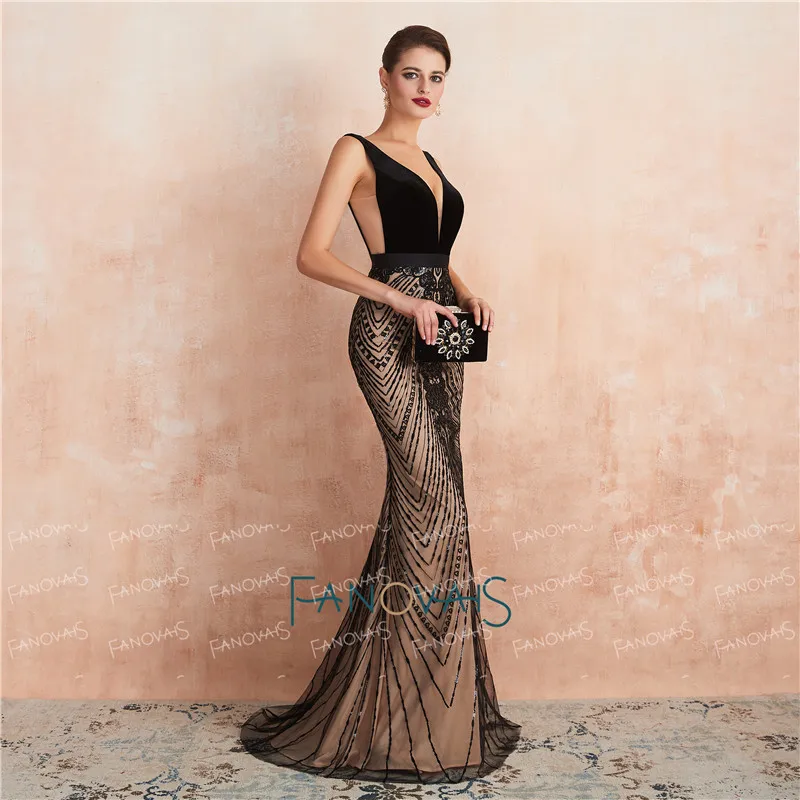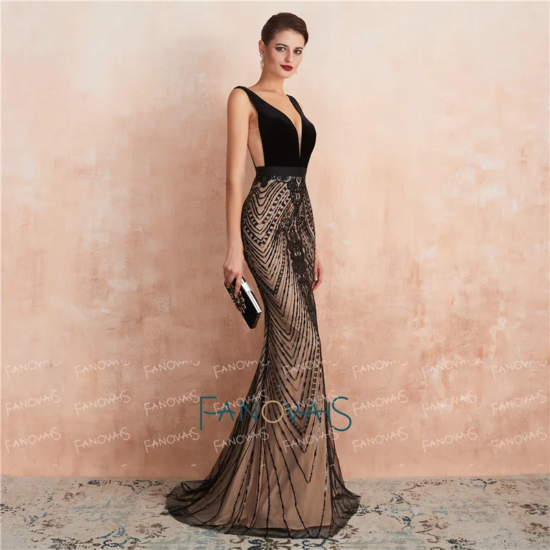 Женское вечернее платье с юбкой годе, Черное длинное бархатное платье с V-образным вырезом и бусинами, бальное платье для выпускного вечера