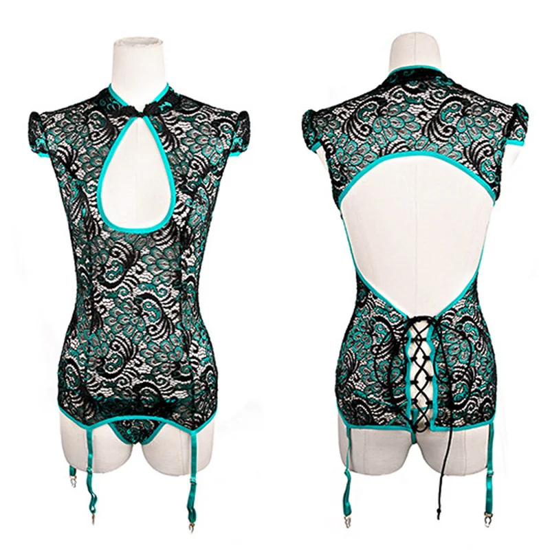 Сексуальное нижнее белье, Женский комплект, кружевной Чонсам с вышивкой павлина, Эротическое нижнее белье, сексуальное женское нижнее белье с открытой спиной, комбинация