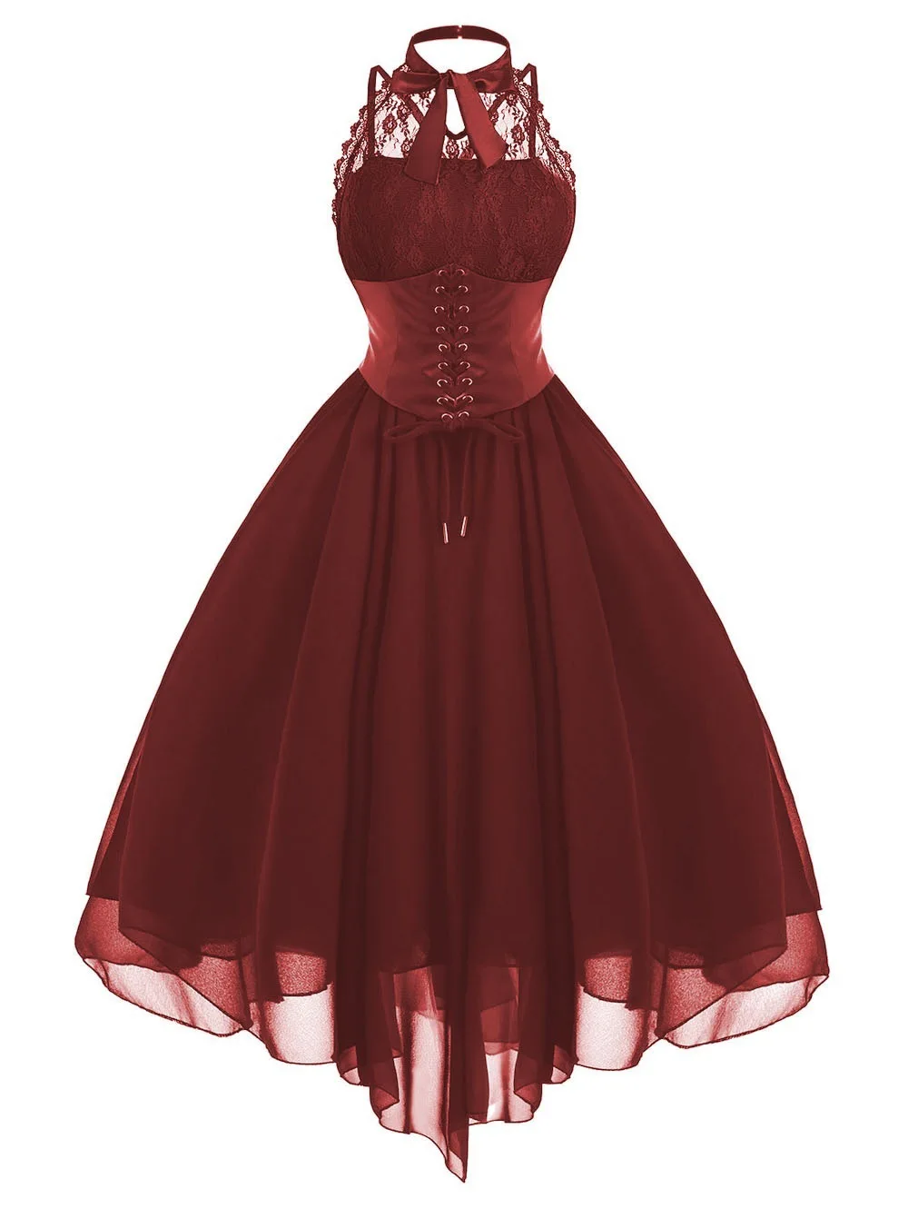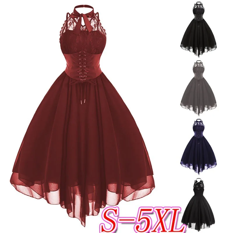 Женское винтажное платье с кружевной юбкой, Бордовое платье средневековой длины в готическом стиле, длинное платье с широкой юбкой, новинка 2019